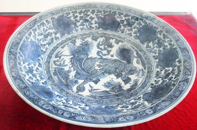 Đĩa gốm vẽ xanh trắng mang biểu tượng linh vật trong lòng đĩa. Giai đoạn từ 1997 đến 2000, Bảo tàng Lịch sử Việt Nam phối hợp với Công ty Visal, Sagahogi Horizon (Maylaisia) khai quật thu 240.000 cổ vật.