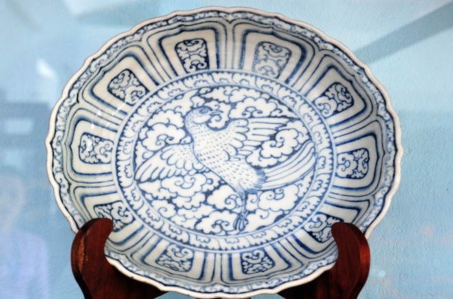 Đĩa gốm có họa tiết hình chim màu xanh trắng tinh xảo. Do nhiều điều kiện khác nhau, đến nay số cổ vật này lần đầu tiên mới được mang ra trưng bày ở đảo Cù Lao Chàm giới thiệu rộng rãi đến du khách.
