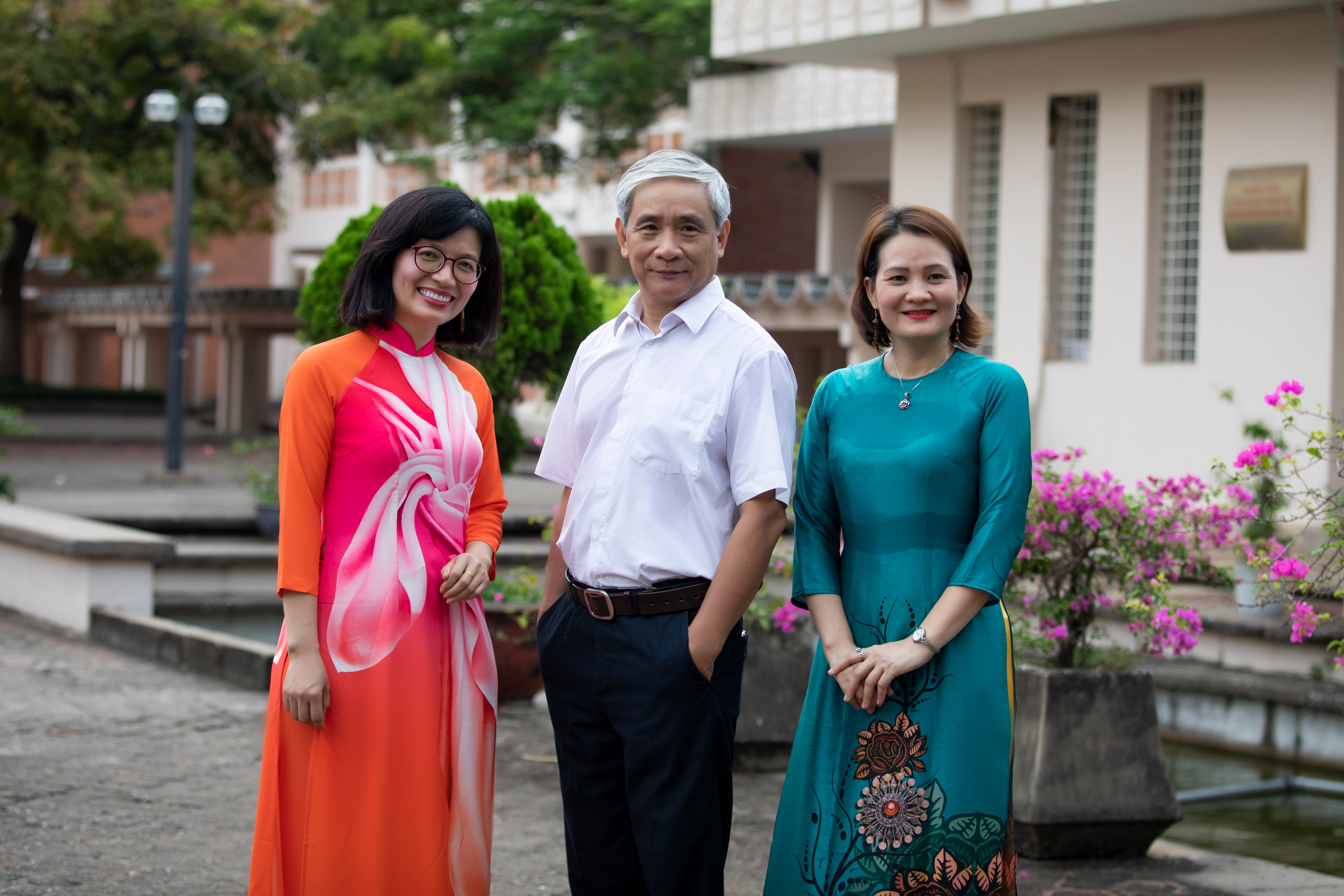 Trưởng khoa NN&VH Pháp Đinh Hồng Vân (giữa), Phó trưởng khoa Đặng Thị Thanh Thuý (áo dài xanh) và Phó trưởng khoa Đàm Minh Thuỷ (áo dài màu cam). |