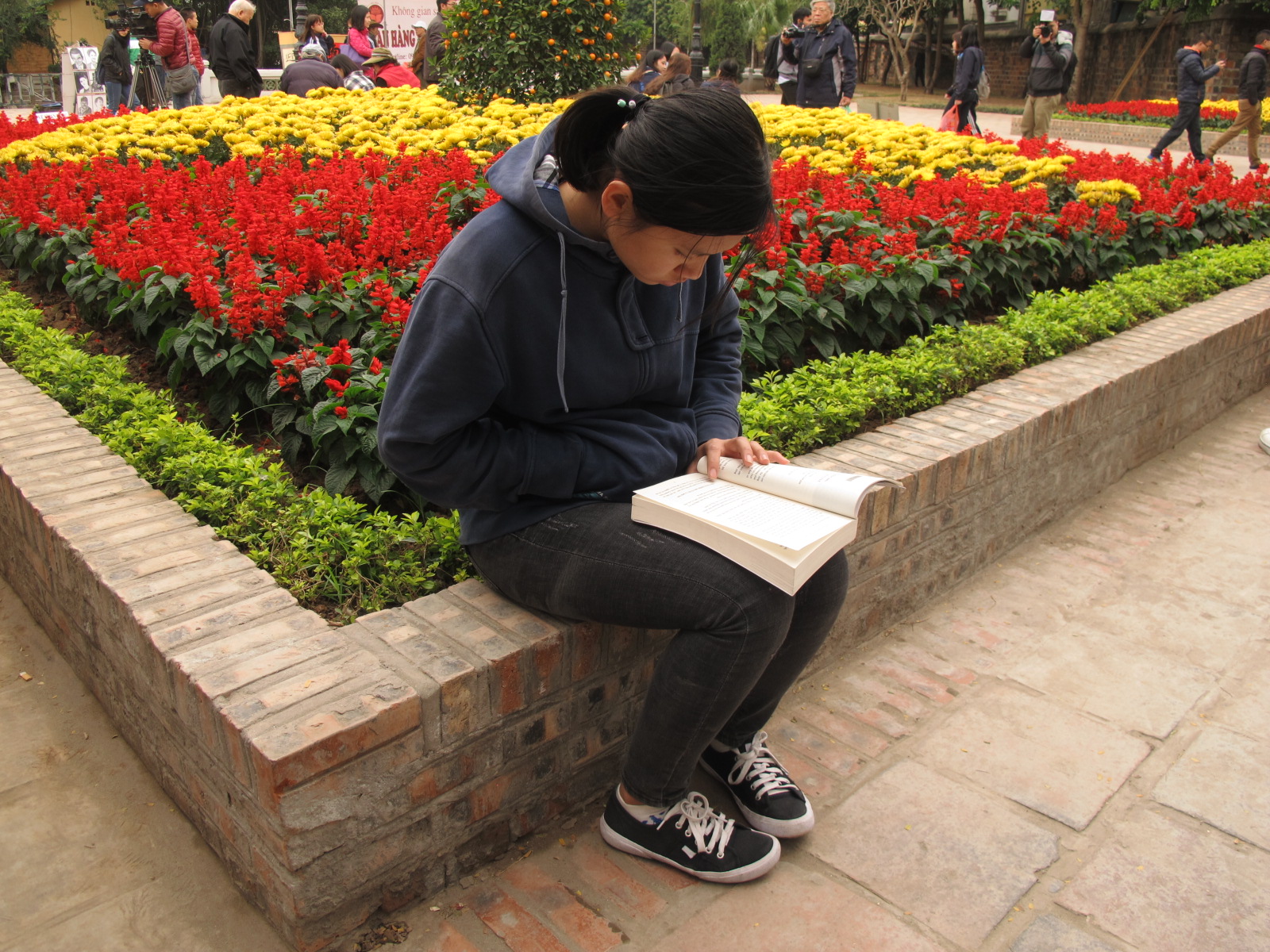 | Nhiều bạn trẻ đọc ngay cuốn sách mới mua được |