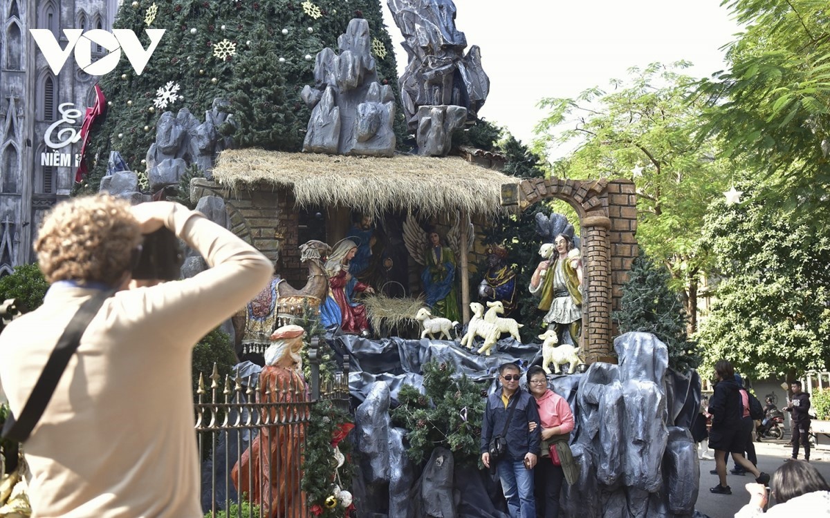 Từ đầu tháng 12, tại Nhà thờ Lớn (phố Nhà Thờ, quận Hoàn Kiếm) đã có một cây thông Noel khổng lồ, cao tới 16m được dựng lên cùng mô hình Chúa Jesus ra đời trên máng cỏ. Ảnh: VOV |