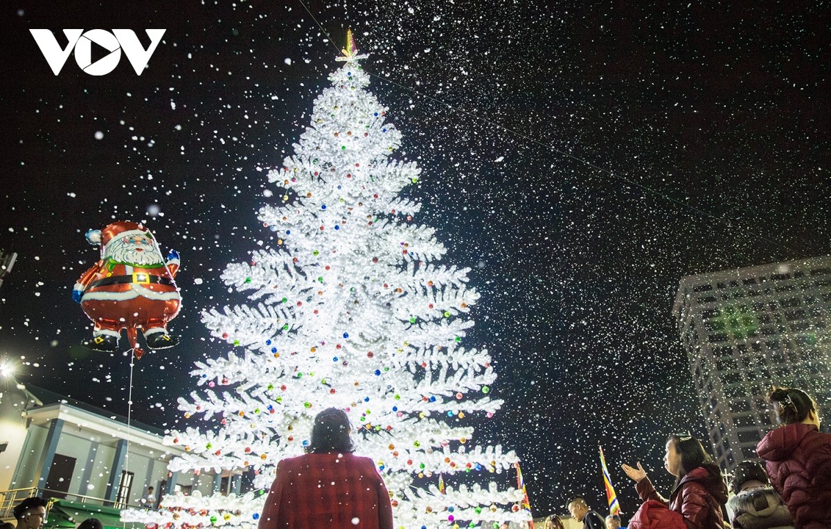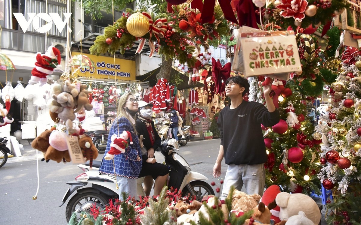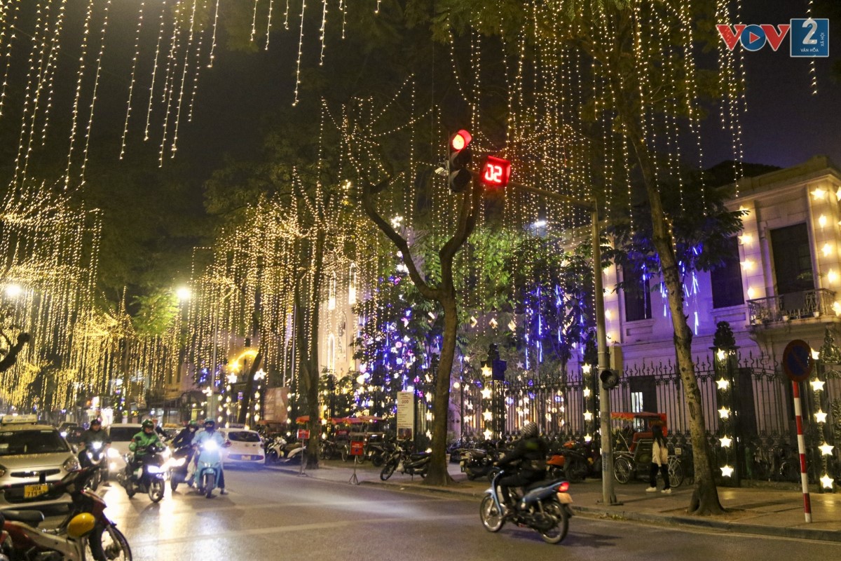 Trên nhiều con phố của Hà Nội ngập tràn sắc màu đỏ, ánh đèn lấp lánh, cùng những cây thông được trang hoàng lung linh. Ảnh: Quyết Thắng/VOV2 |