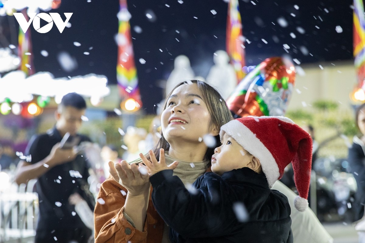 Khách đến tham quan hào hứng chiêm ngưỡng những bông tuyết nhân tạo với khung cảnh tựa như đêm Noel trong những câu chuyện cổ tích. Ảnh: Trường Giang/VOV |