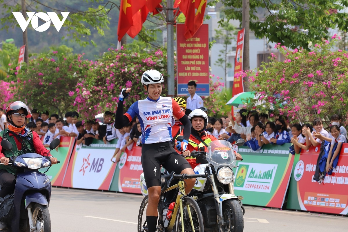 | Nguyễn Văn Thiện chia sẻ: "Chặng đường Sơn La khó khăn hơn trong Nam, ở đây có dốc, lên xuống nhiều và có cả đèo; cũng nhờ những đoạn nhiều dốc như vậy nên mình tận dụng đổ dốc với tốc độ cao để dành chiến thắng". |