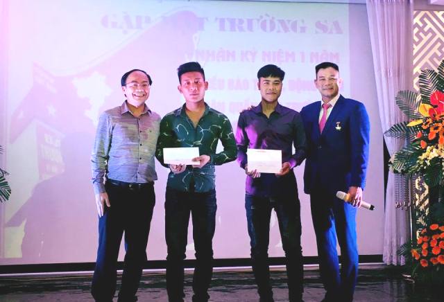 | Nhóm báo chí tham gia đoàn công tác số 6 thăm Trường Sa năm 2016 tặng quà cho hai chiến sĩ trẻ công tác tại đảo Sinh Tồn, nơi đoàn đã từng đến thăm. |