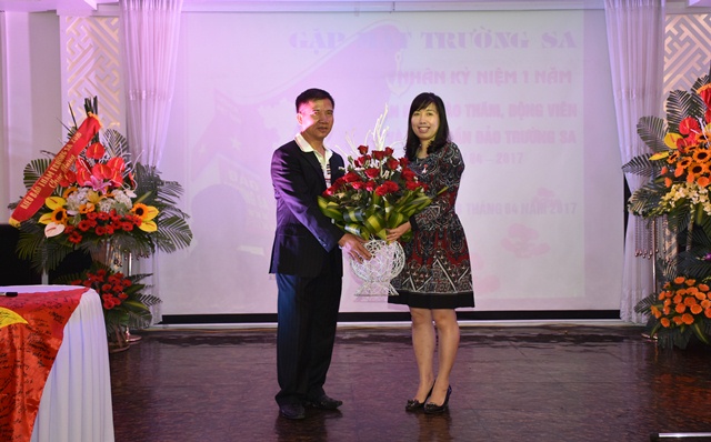 | Bà Lê Thị Thu Hằng, Vụ trưởng Vụ Thông tin Báo chí, người Phát ngôn Bộ Ngoại giao nhận hoa chúc mừng từ đại diện kiều bào. Bà Lê Thị Thu Hằng là trưởng đoàn công tác số 6 năm 2016 ra thăm cán bộ, chiến sĩ Trường Sa. |