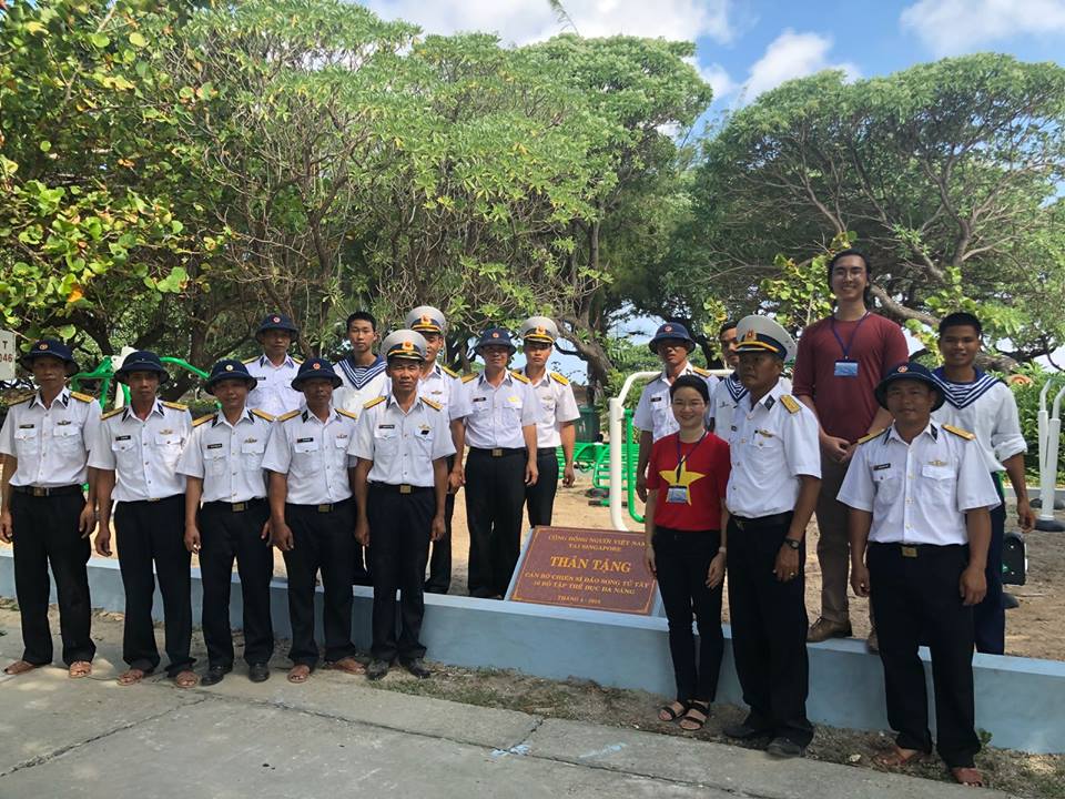 Cán bộ, chiến sĩ đảo Song Tử Tây tiếp nhận 10 bộ dụng cụ thể dục đa năng lắp đặt thành sân tập ngoài trời do cộng đồng người Việt Nam tại Singapore trao tặng.