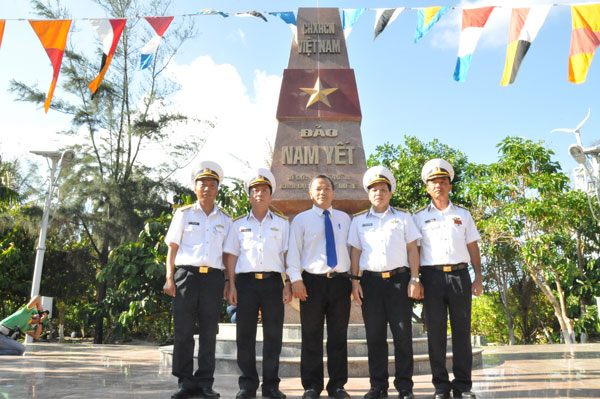Thứ trưởng Vũ Hồng Nam chụp ảnh lưu niệm tại cột mốc chủ quyền đảo Sơn Ca