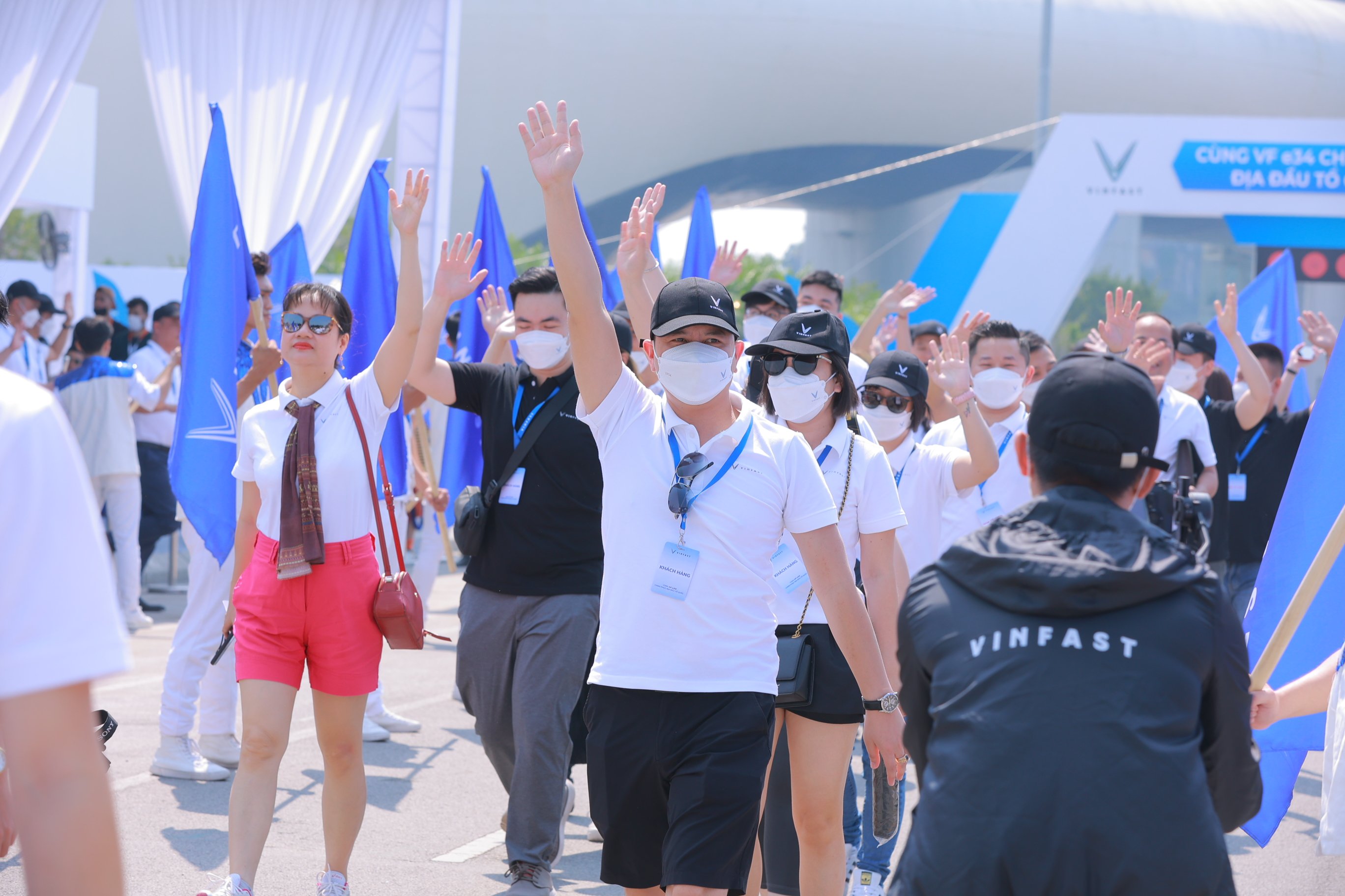 100 chiếc xe ô tô điện VF e34 xếp thành chữ V tại nơi làm lễ xuất phát. |