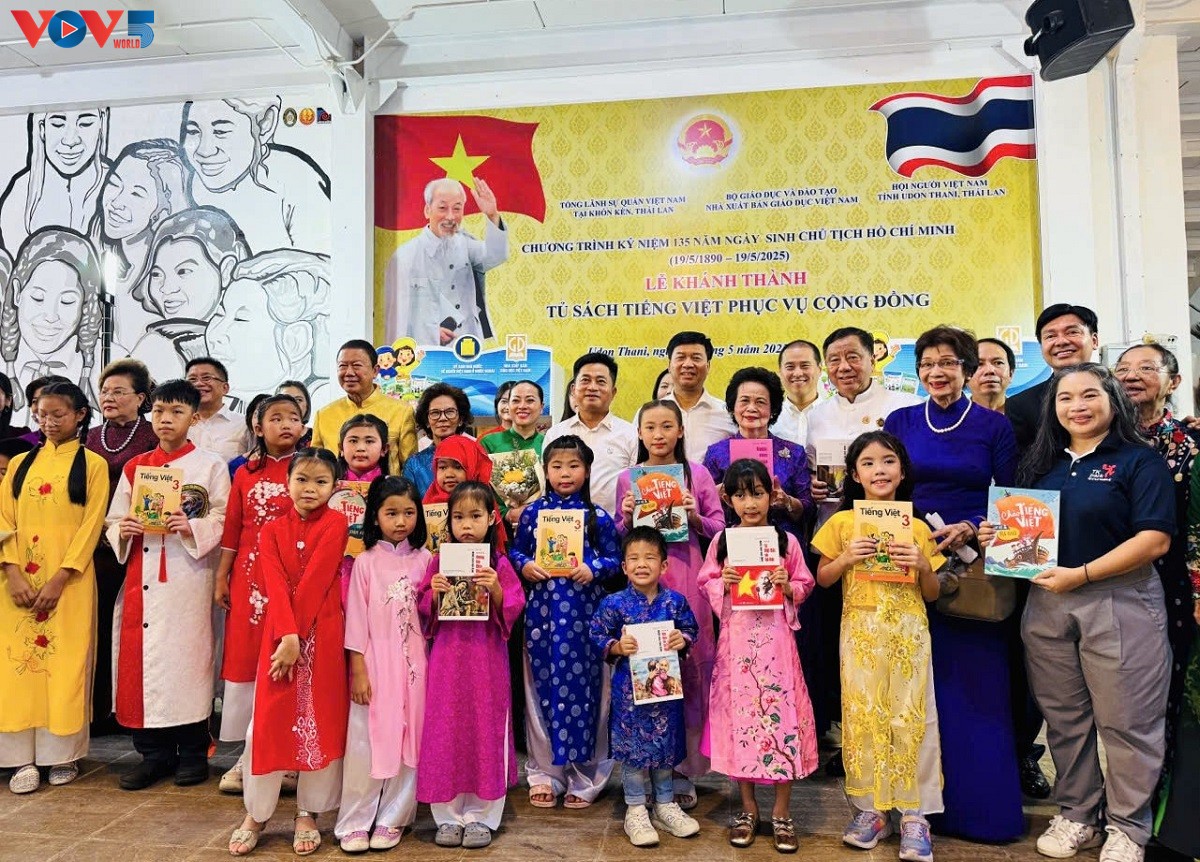 Nhân kỷ niệm 135 năm Ngày sinh Chủ tịch Hồ Chí Minh, chiều 18/5, lễ ra mắt Tủ sách tiếng Việt phục vụ cộng đồng đã diễn ra tại Trường tiếng Việt Khánh An, Phố Việt Nam (Việt Nam Town), tỉnh Udon Thani, Đông Bắc Thái Lan. Ảnh: PV/VOV – Bangkok |