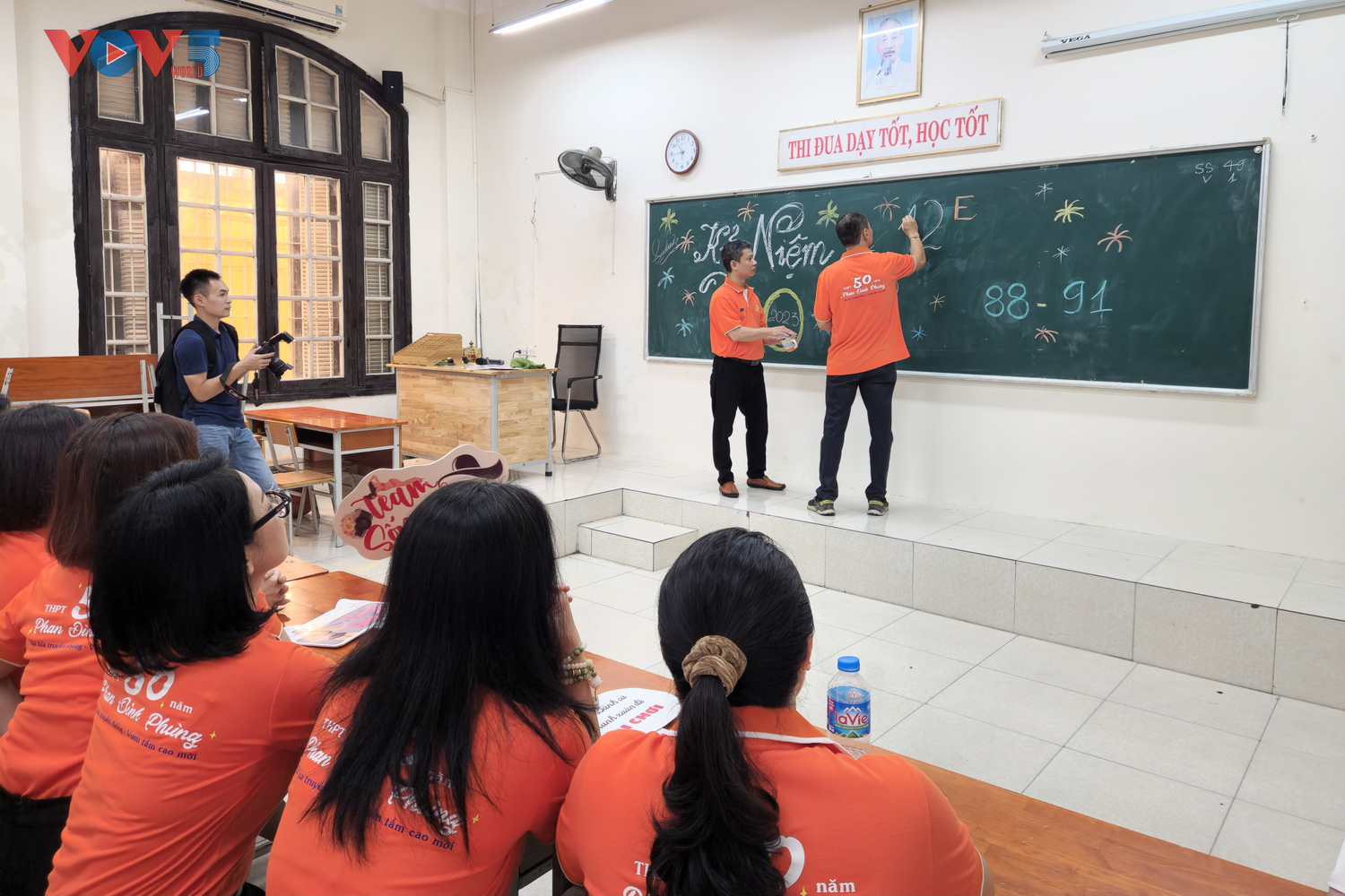 | Mọi người đều đã liên lạc trước để cùng hẹn gặp, có nhiều lớp còn thiết kế áo đồng phục, quay lại phòng học cũ để ôn lại kỷ niệm. Ảnh: Buổi gặp của các cựu học sinh lớp 12E khóa 1988-1991. |