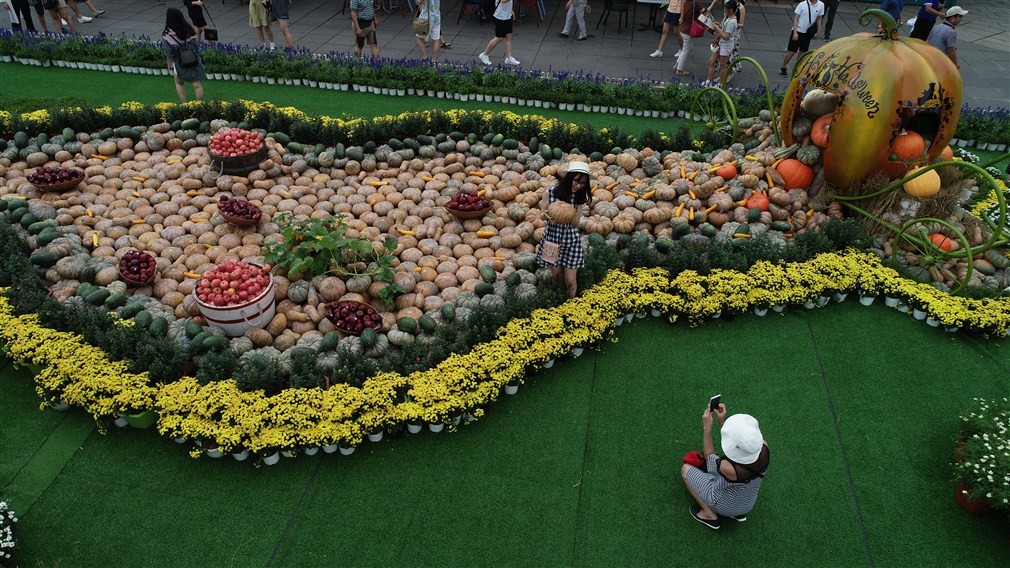 Quảng trường Du Dôme- sân khấu chính của Lễ hội Halloween trên đỉnh Bà Nà trở thành “dòng sông bí” với hàng trăm trái bí lớn nhỏ, bao quanh là những chậu hoa cúc nhỏ xinh, uốn lượn.