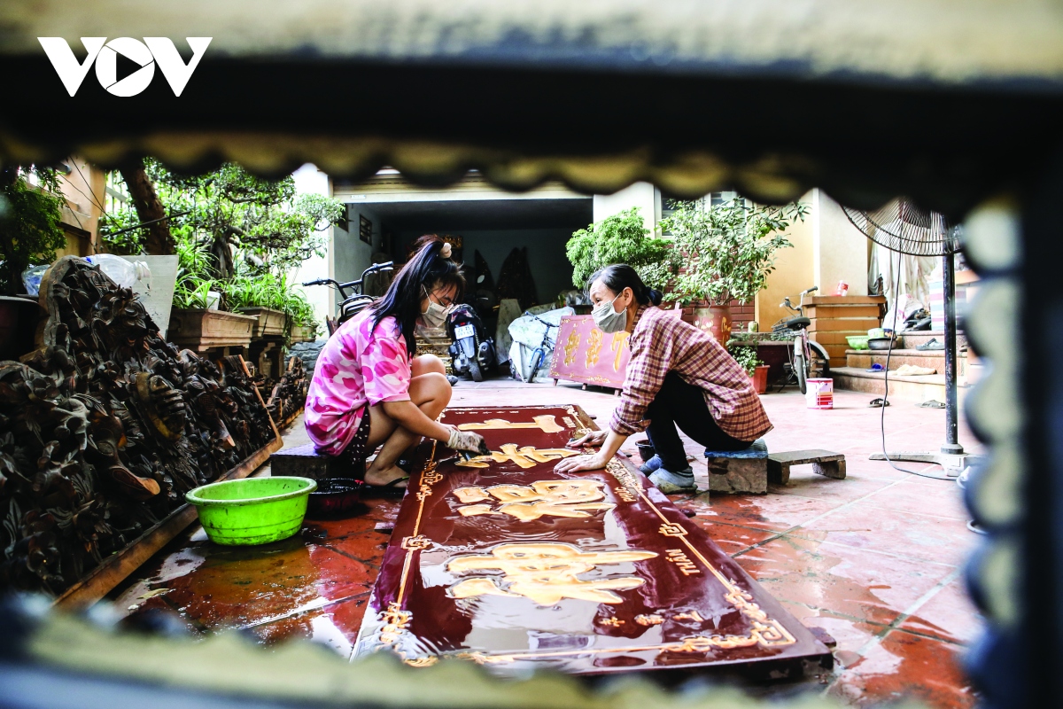Mỗi câu đối được người thợ ráp nước và đánh bóng cẩn thận. |