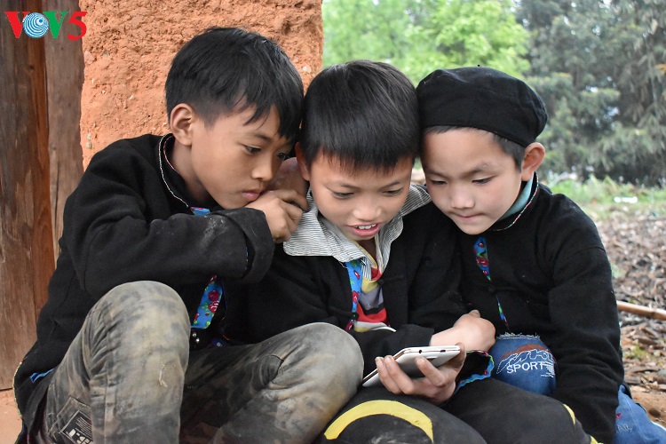 Những cậu bé người Dao say sưa bên chiếc điện thoại.