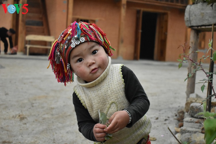 Em bé người Dao đáng yêu với chiếc mũ đủ màu sắc truyền thống của dân tộc mình.