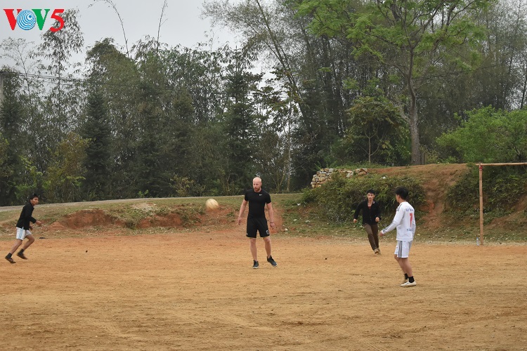 Nhiều du khách nước ngoài tham gia vào các hoạt động thể thao với thanh niên trong thôn.