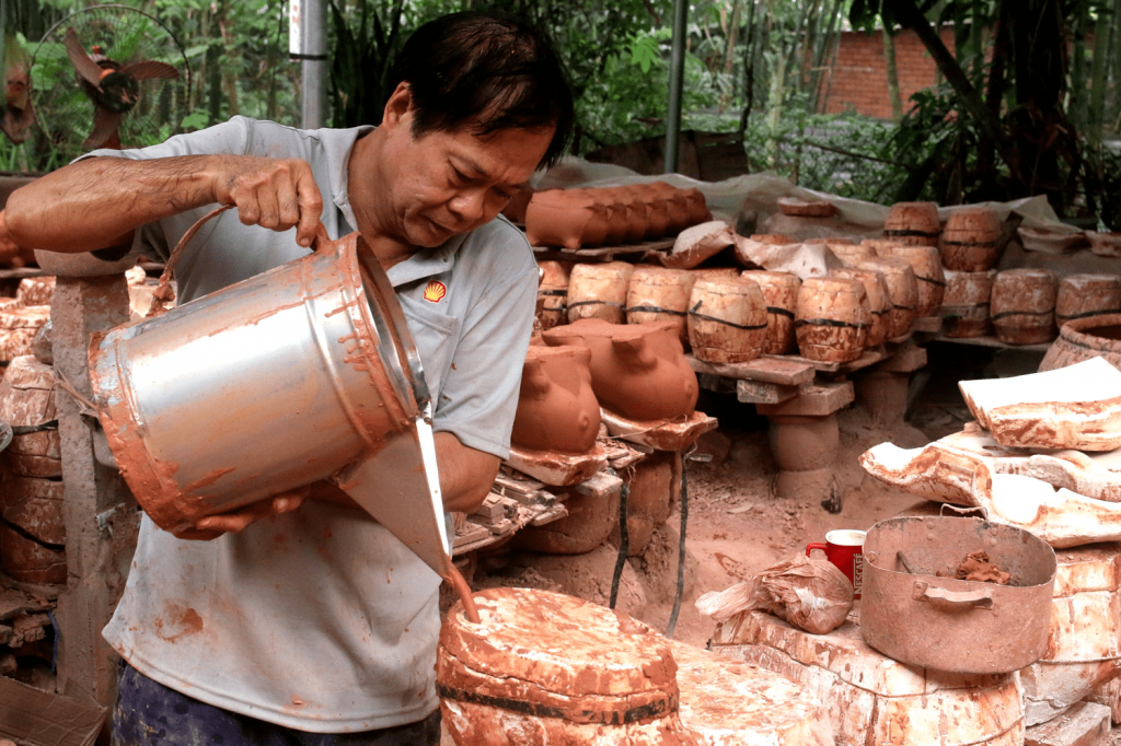 Để có những chú “trâu vàng” công đoạn đầu tiên là trộn đất. Ông Nguyễn Văn Nhàn (phường Tân Phước Khánh, thị xã Tân Uyên), với hơn 30 năm làm nghề cho biết, đất sẽ pha nước, cho thêm keo và đánh mịn trước khi sử dụng. Năm nay, gia đình ông Nhàn làm hơn 10.000 con trâu đất theo đơn hàng từ các thương lái