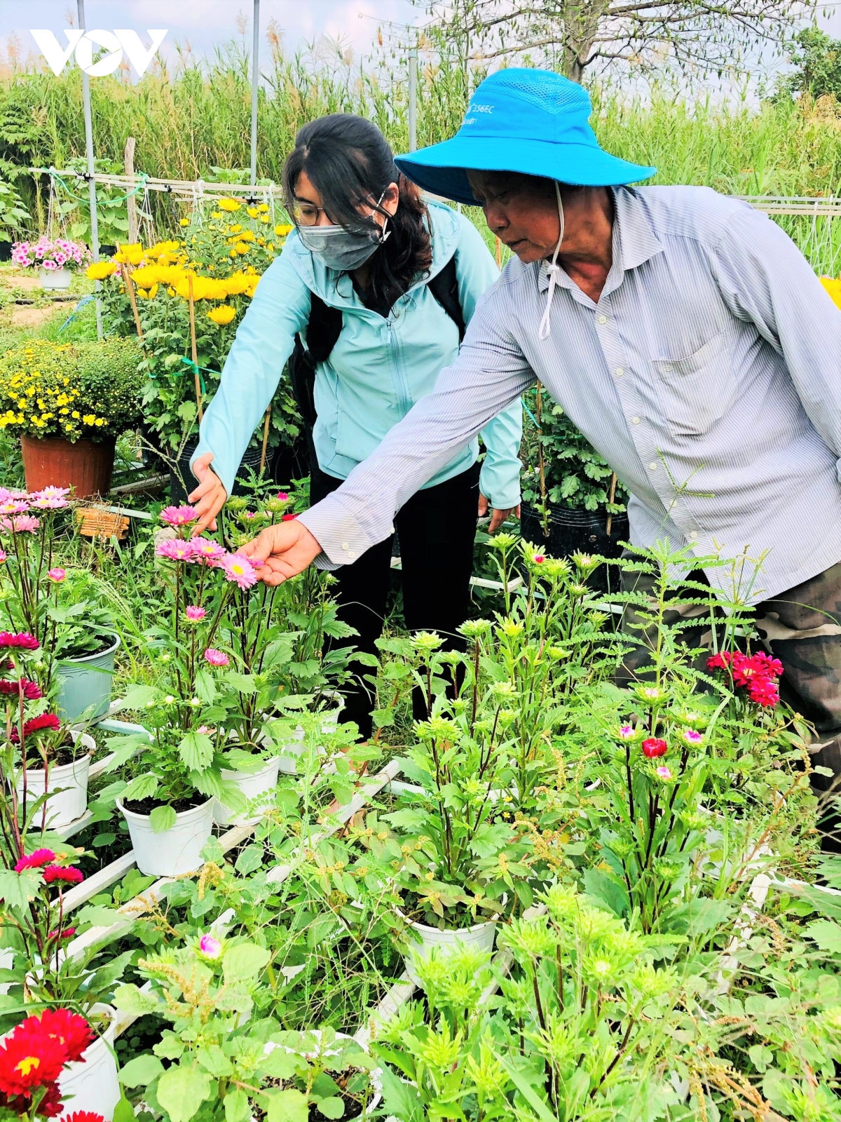Ông Đoàn Hữu Bốn, Phó Chủ nhiệm Làng nghề hoa kiểng Phó Thọ - Bà Bộ đang cùng khách lựa chọn hoa Tết