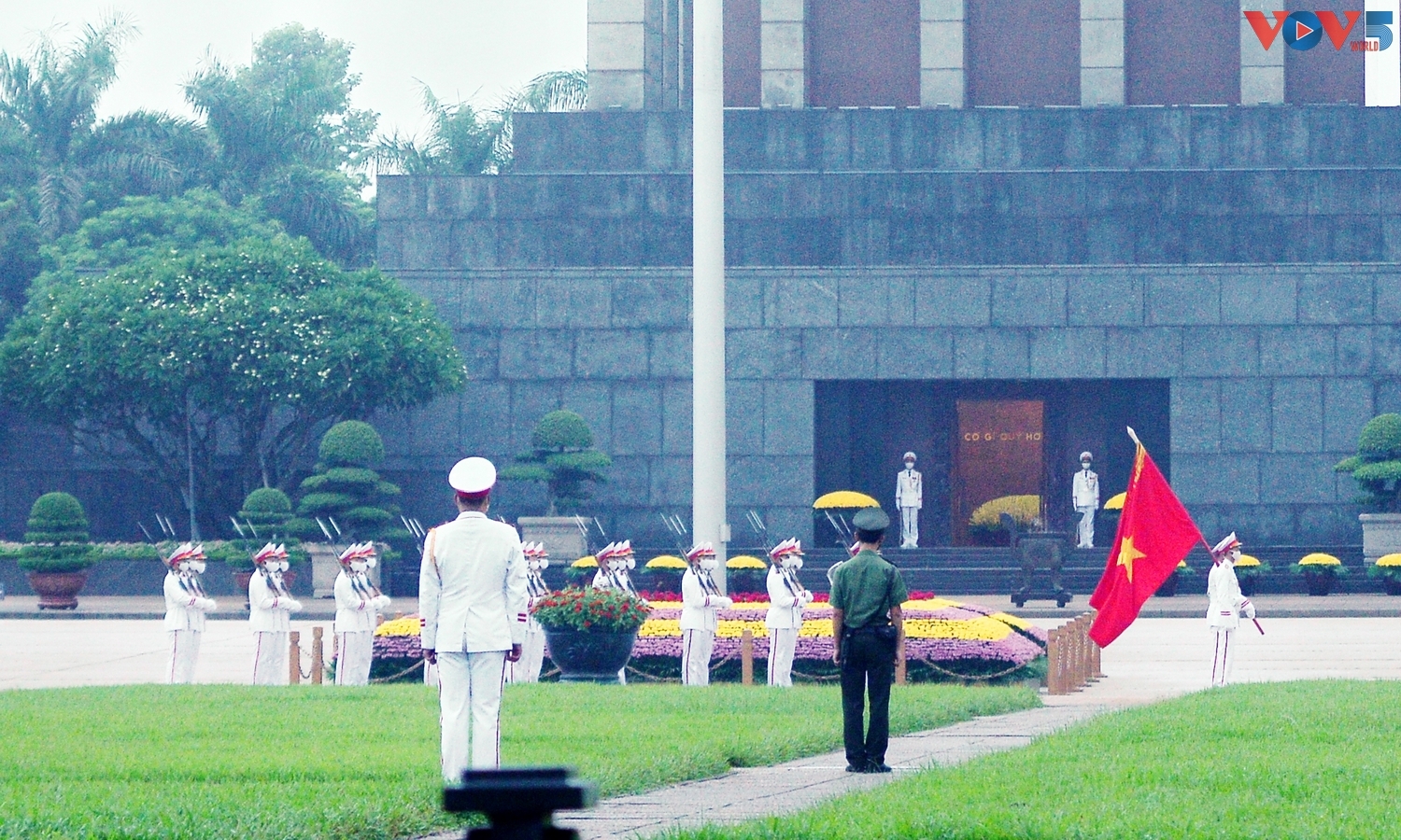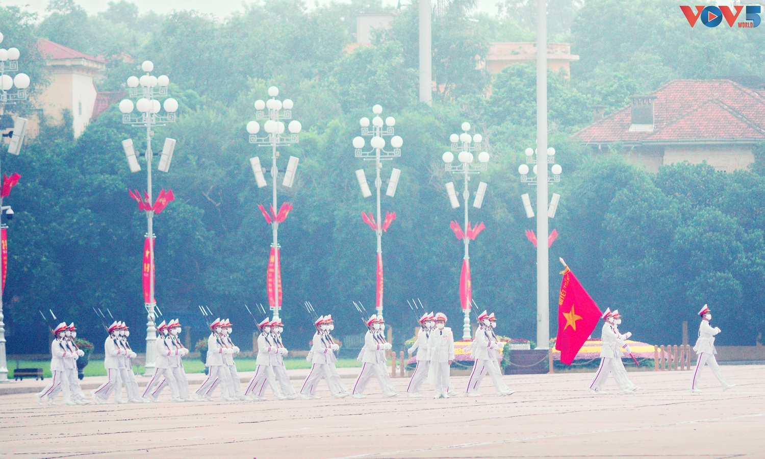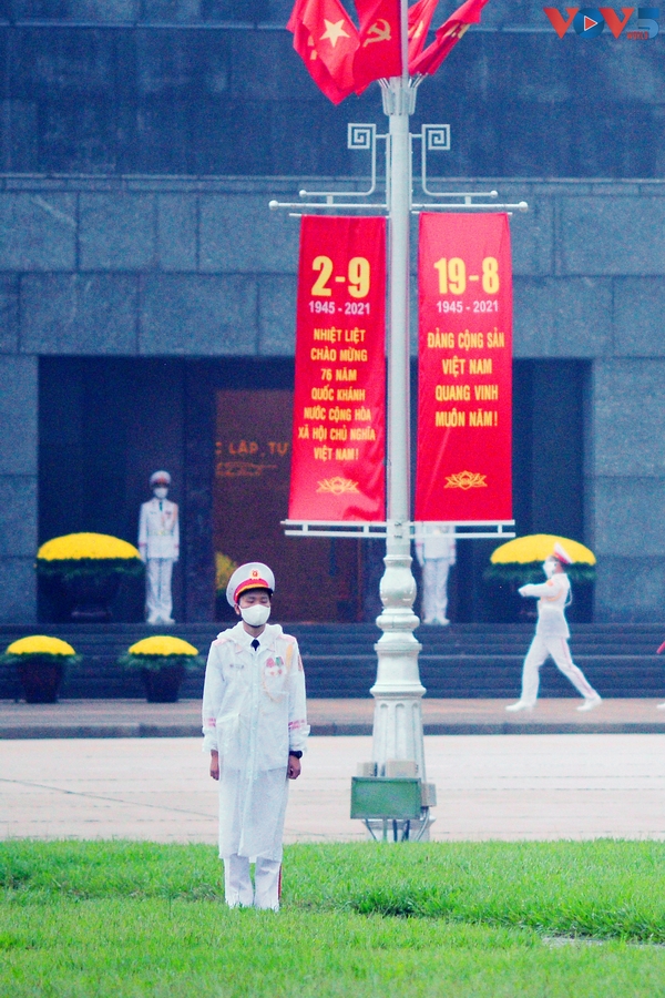 | 5 giờ 59 phút sáng ngày 2 tháng 9, dưới màn mưa nhẹ đầu thu, đoàn tiêu binh là các chiến sĩ thuộc Đoàn 275 (Bộ Tư lệnh bảo vệ Lăng Chủ tịch Hồ Chí Minh) đều bước, tiến vào quảng trường để thực hiện lễ chào cờ. |