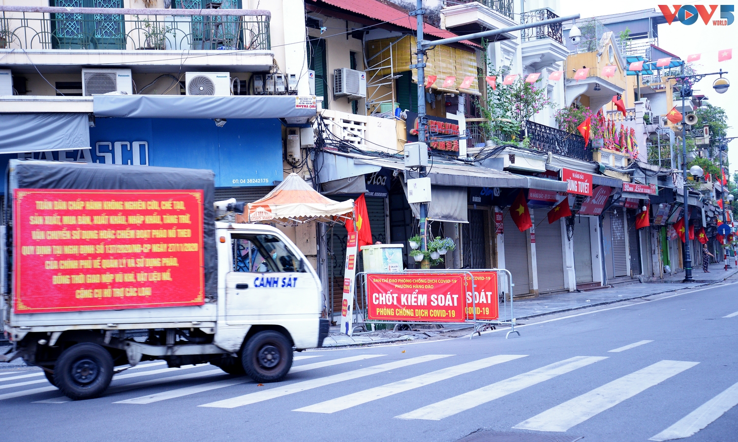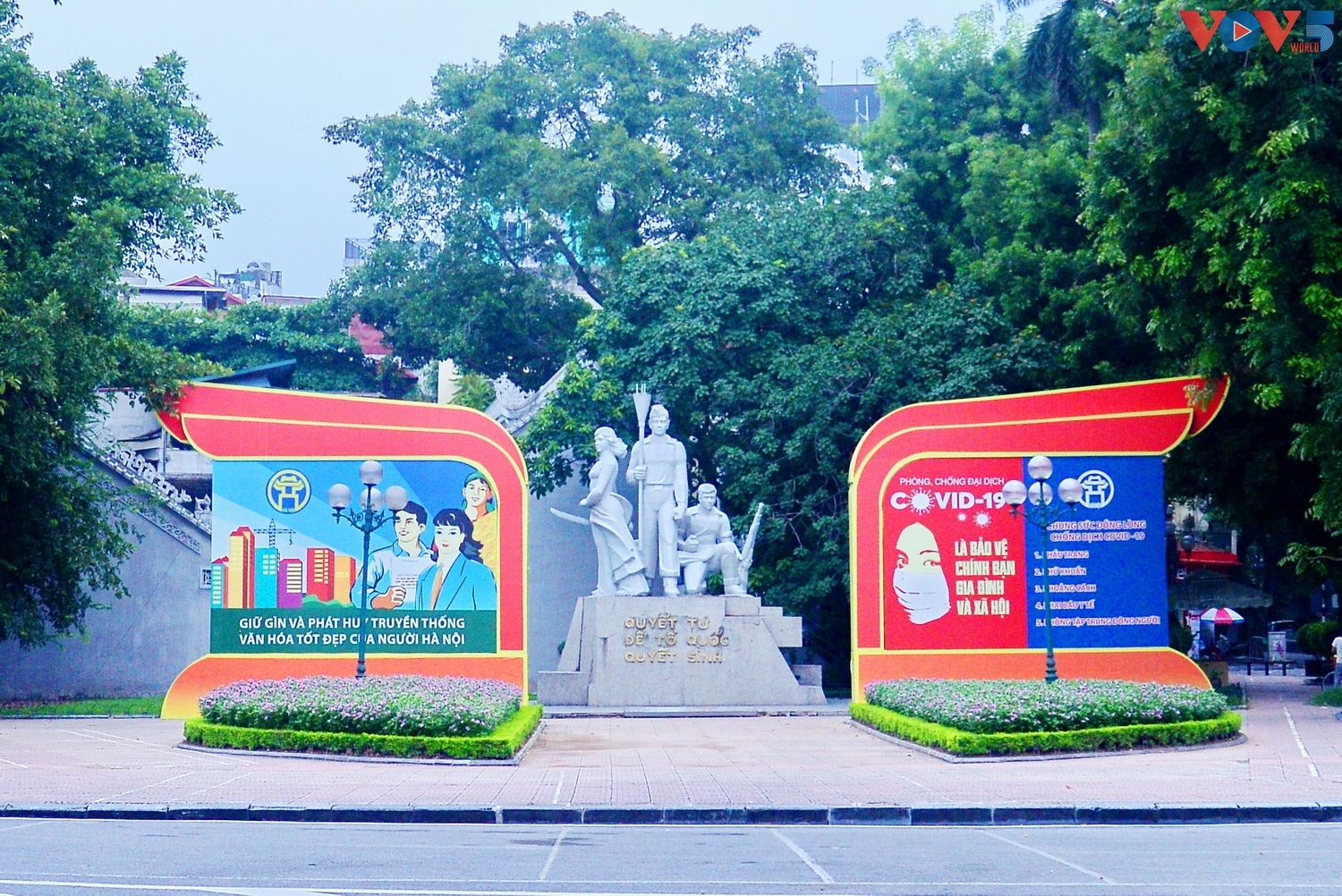 | Tại các quảng trường, tuyến đường lớn, bên cạnh băng rôn biểu ngữ chào mừng Quốc khánh, vẫn là những khẩu hiệu phòng chống đại dịch. |