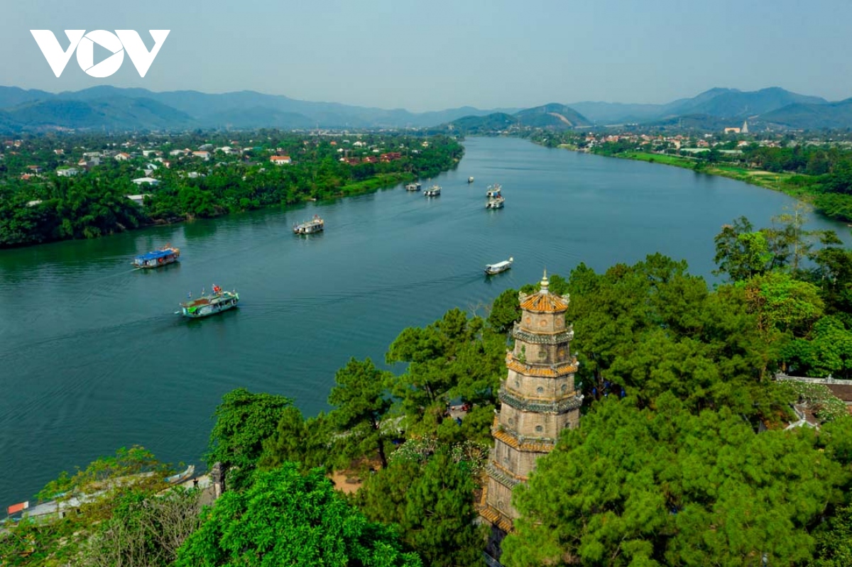 Đoàn rước trên sông đoạn trước chùa Linh Mụ. |