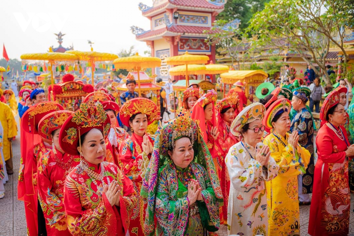 Đoàn rước hàng trăm người tái hiện nét văn hóa truyền thống tín ngưỡng độc đáo, phô diễn đa dạng trang phục cổ xưa đầy sắc màu kết hợp với các hình thức diễn xướng, vũ điệu đặc trưng của tín ngưỡng thờ Mẫu. |