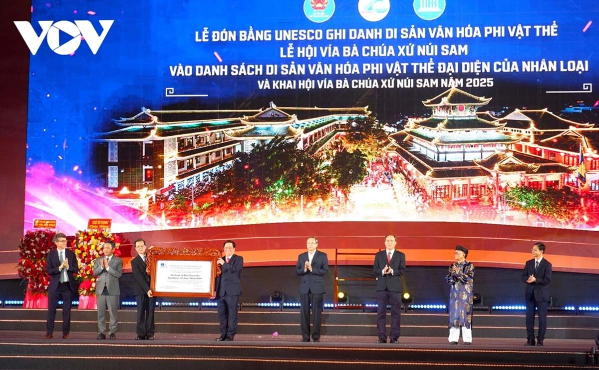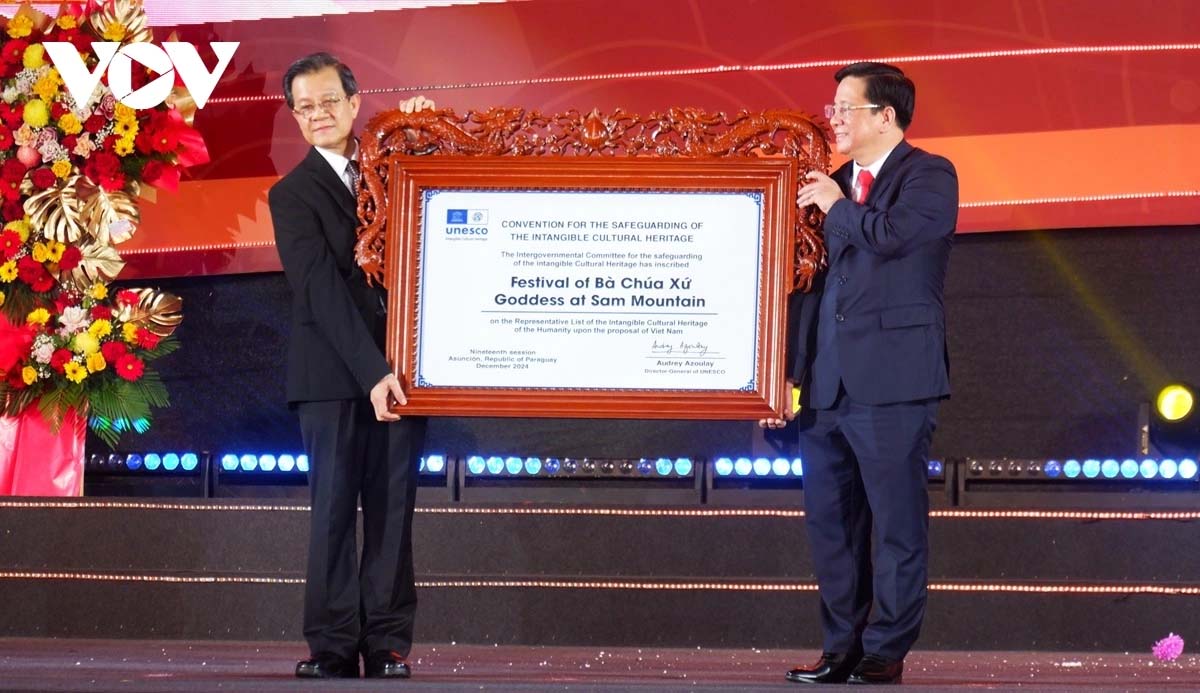 Ngày 4/12/2024, Hội nghị lần thứ 19 của Ủy ban Liên Chính phủ Tổ chức Giáo dục, Khoa học và Văn hoá của Liên Hợp quốc (UNESCO) về bảo vệ di sản văn hoá phi vật thể đã chính thức ra Nghị quyết ghi danh “Lễ hội Vía Bà Chúa Xứ Núi Sam” vào Danh sách Di sản văn hóa phi vật thể đại diện của nhân loại.