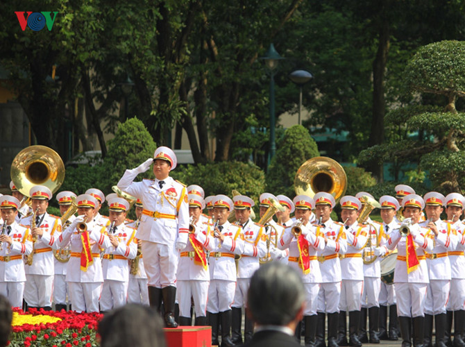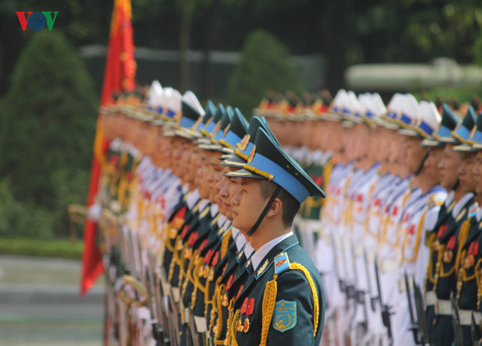 | Đúng 9h, tại Phủ Chủ tịch, lễ đón chính thức Tổng Bí thư, Chủ tịch nước Lào Bounnhang Volachith đã diễn ra với những nghi thức cao nhất dành cho nguyên thủ quốc gia. |