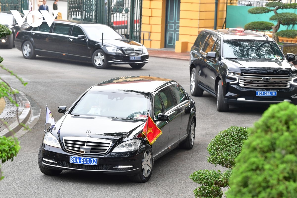 Đoàn xe chở Nhà vua Philippe và Hoàng hậu Mathilde tiến vào Phủ Chủ tịch. |