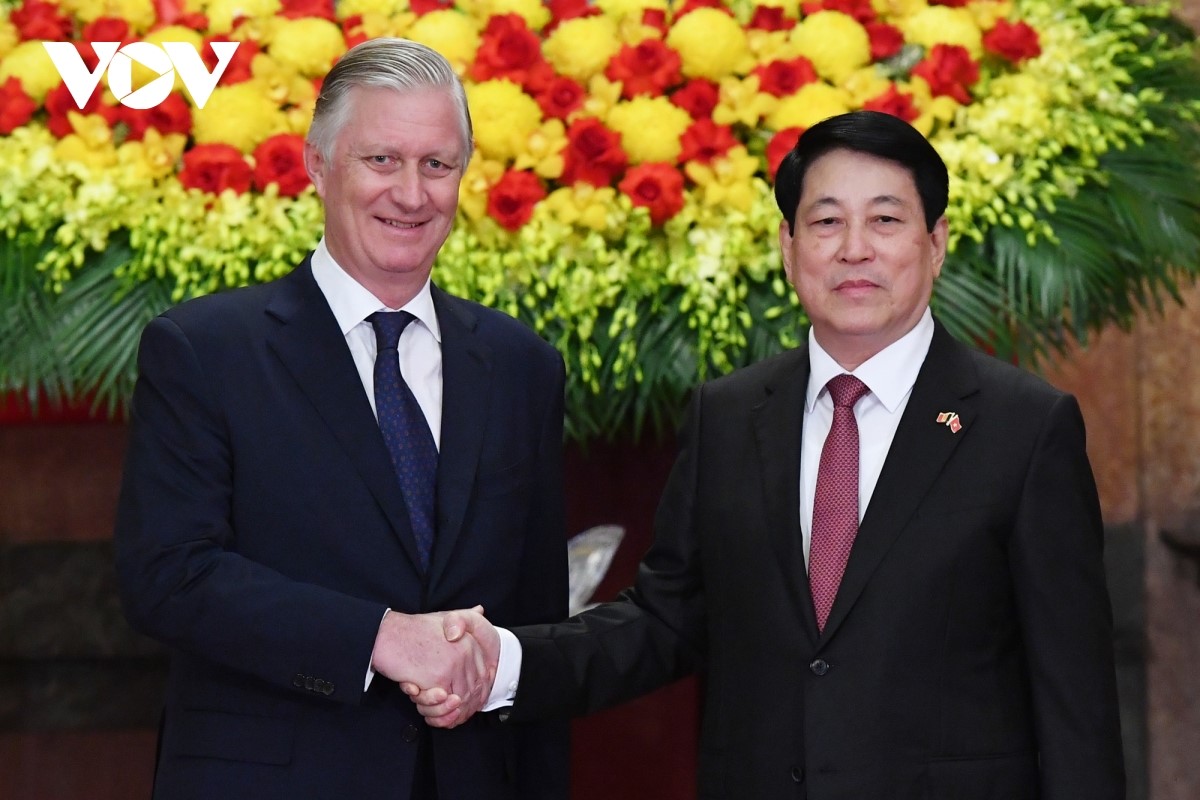 Chủ tịch nước Lương Cường và Nhà vua Philippe chụp ảnh chung trước khi dẫn đầu hai đoàn cấp cao tiến hành hội đàm. |