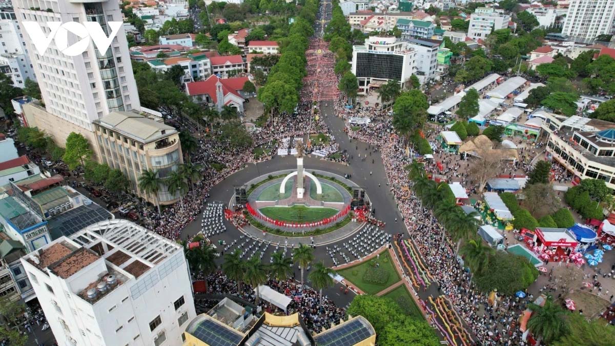 | Cả 6 tuyến phố hướng về Tượng đài chiến thắng Buôn Ma Thuột đều chật kín người. |
