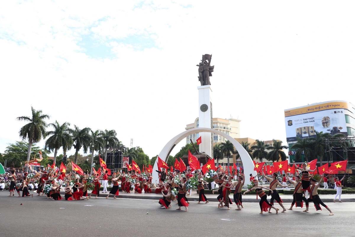 | Rực rỡ cờ hoa trong lễ hội đặc sắc lần này, đúng vào dịp Kỷ niệm 50 năm chiến thắng Buôn Ma Thuột, giải phóng tỉnh Đắk Lắk. |