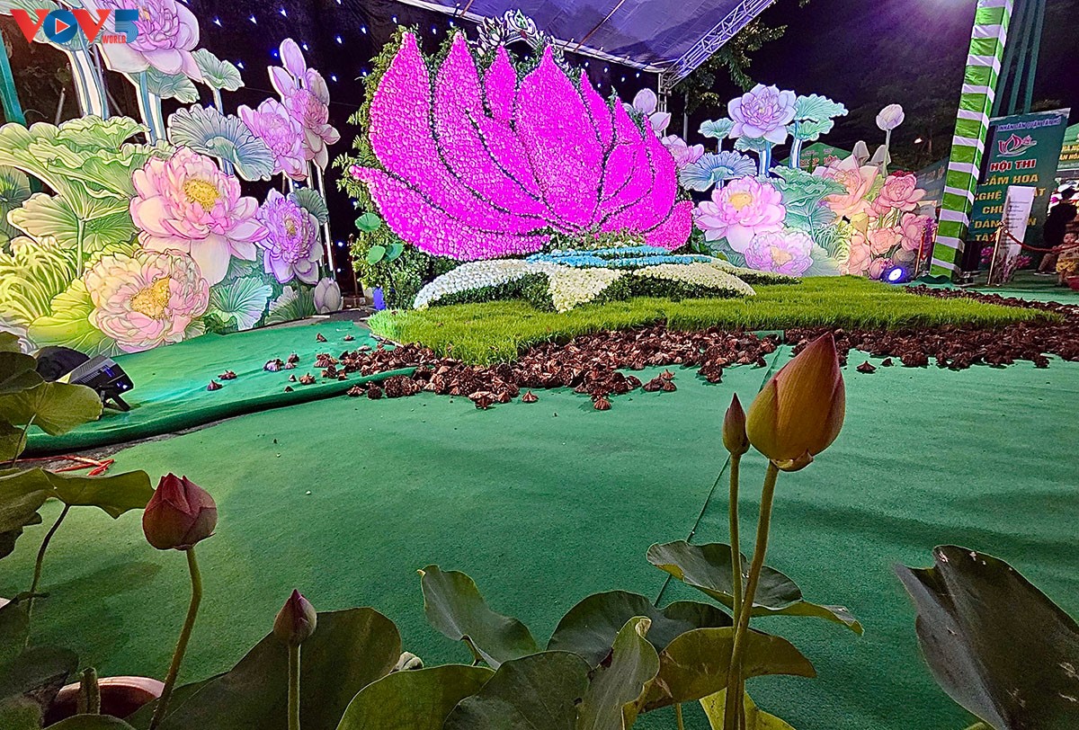 | Điểm nhấn của Lễ hội năm nay là bông Sen khổng lồ mang tên “Thăng Long Huyền Diệu Hoa" có chiều cao 4m, rộng 10m, được kết bằng 10.000 bông hoa Sen Quan âm. |