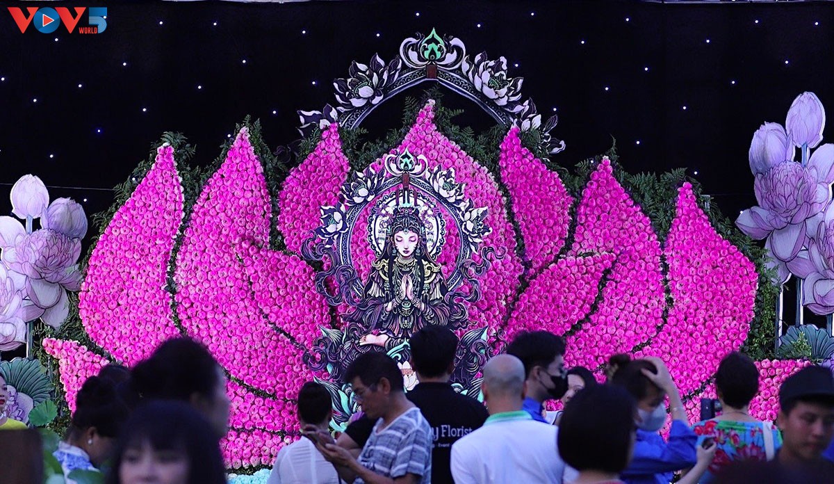 | Tác phẩm đặc biệt này do Kỷ lục gia nghệ nhân Lê Thị Lương và họa sĩ đương đại Migoii Võ Quang Luân đến từ Paris - Pháp thực hiện. Toàn bộ 10.000 bông hoa Sen Quan âm do Hội Phụ nữ phường Nhật Tân quận Tây Hồ, team Nhất Tâm và anh em trong cộng đồng hoa Việt tài trợ. |
