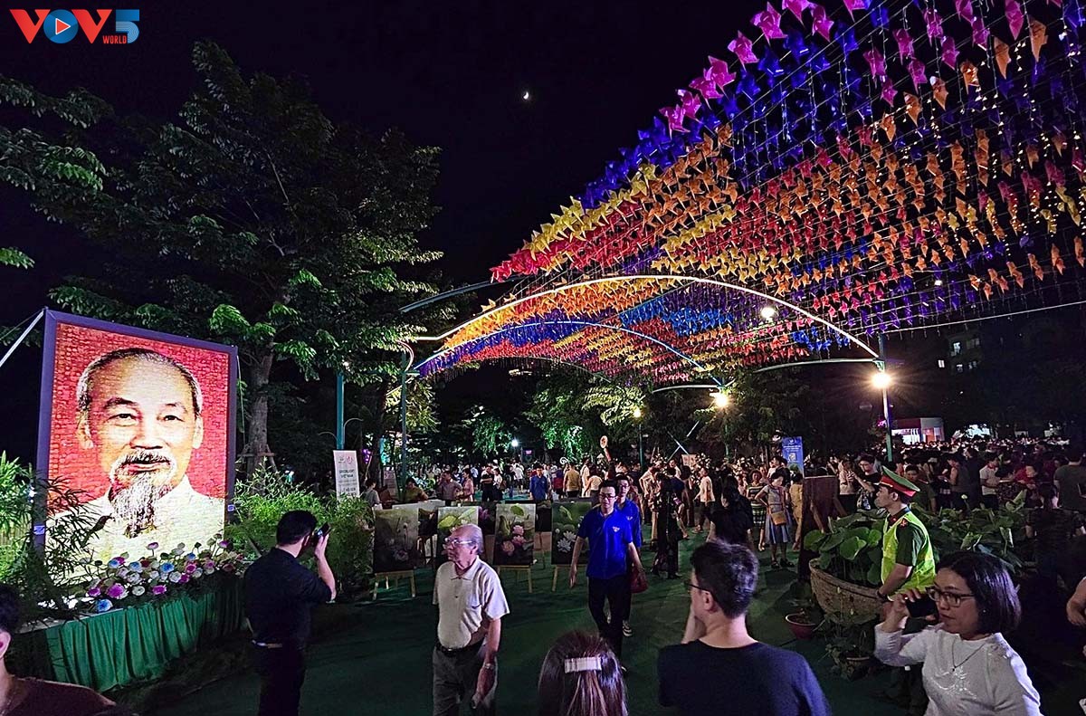 | Cùng với đó, khi đến với Lễ hội Sen Hà Nội 2024, du khách được chiêm ngưỡng bức tranh chân dung Chủ tịch Hồ Chí Minh có kích thước 1,7m x 2,5m. |