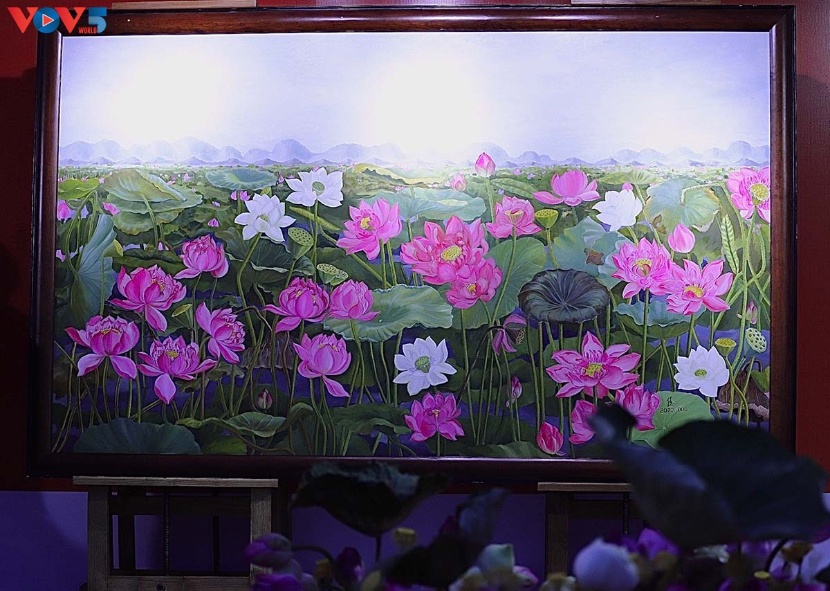 | Được trưng bày ở vị trí trang trọng trong lễ hội, bức tranh Sen "Liên hoa tịnh cảnh" dành được sự chú ý của du khách. Đây là tác phẩm của hoạ sỹ Nguyễn Thị Kim Đức được trưng bày tại sự kiện triển lãm Sen Việt năm 2023, tổ chức tại chùa Quán Sứ, Hà Nội. Tác phẩm được gia trì bởi các vị cao Tăng như Trưởng lão Hòa thượng Thích Trí Quảng - Đức Pháp chủ Giáo hội Phật giáo Việt Nam, Hòa thượng Thích Thiện Nhơn - Chủ tịch Giáo hội Phật giáo Việt Nam. Đức Pháp Vương Gyalwang Drukpa XII, Đức tăng thống Myanmar Sayadaw Sandimar Bhivamsa khi tới Việt Nam cũng đã chiêm ngưỡng và gia trì cho bức tranh này. |