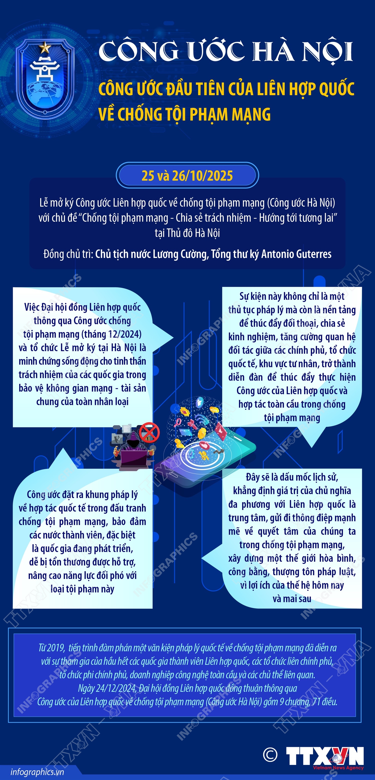 Lễ mở ký Công ước Hà Nội với chủ đề “Chống tội phạm mạng - Chia sẻ trách nhiệm - Hướng tới tương lai” được tổ chức trong 2 ngày 25-26/10. Sự kiện này được kỳ vọng "sẽ đặt nền móng cho một văn kiện toàn cầu mang tính lịch sử trong lĩnh vực phòng chống tội phạm mạng, tương tự như các công ước của Liên Hợp Quốc về tội phạm có tổ chức xuyên quốc gia ký năm 2000 và công ước về chống tham nhũng ký năm 2003”.