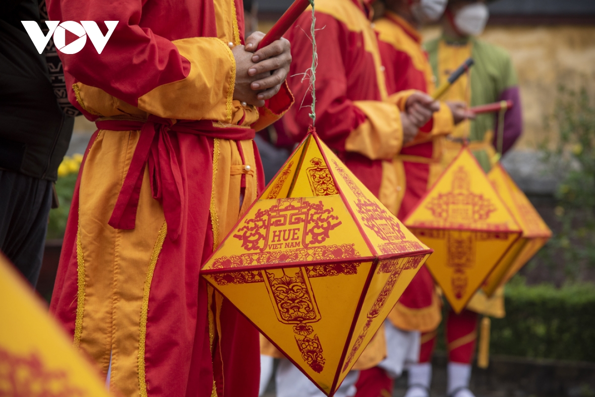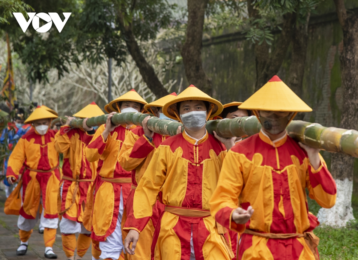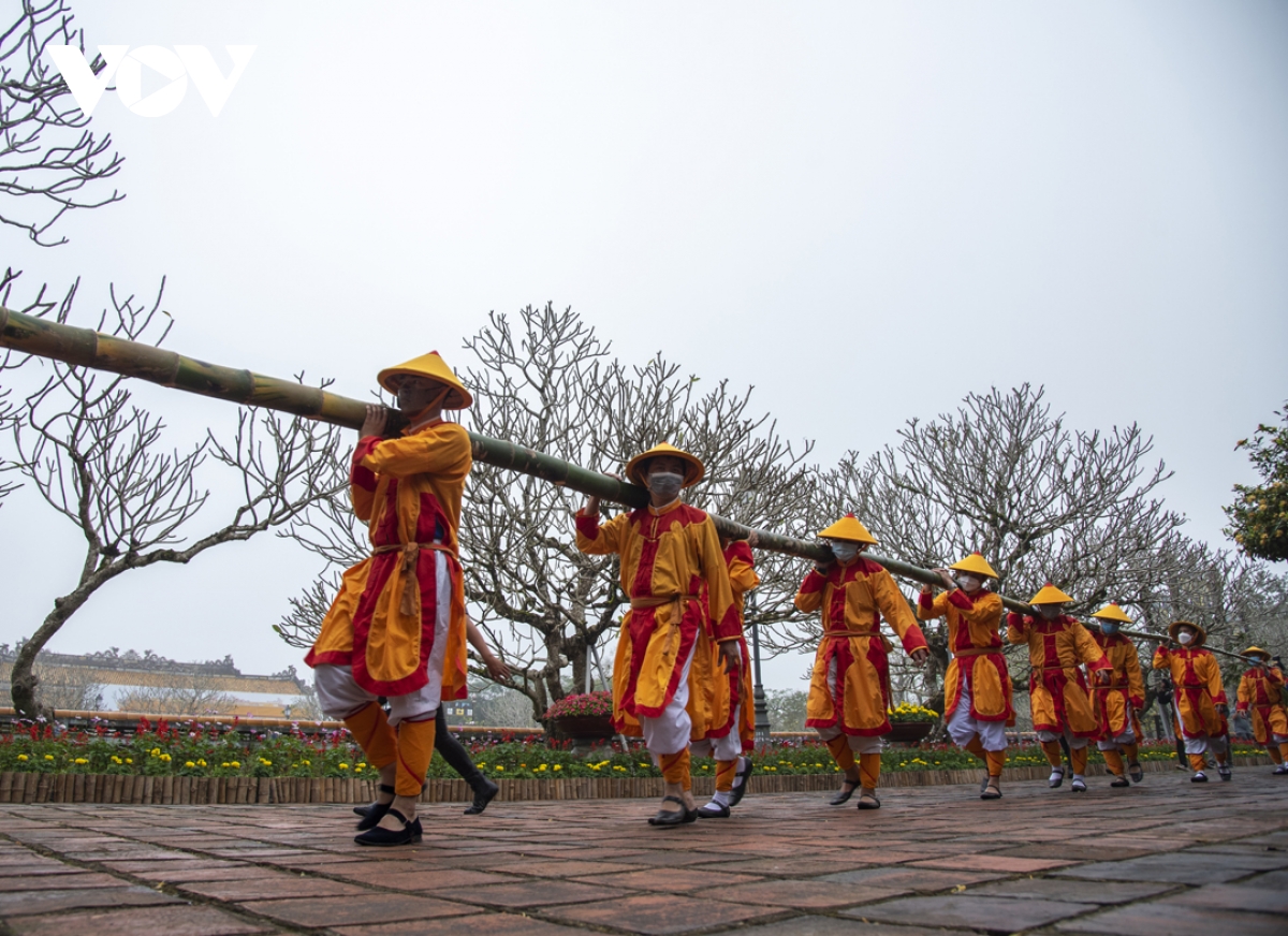 10 lính vác nêu trong trang phục chỉnh tề, đội rước nêu khởi hành trong âm thanh của tiểu nhạc tiến vào Hoàng Cung, đến Triệu Tổ Miếu và tiến hành nghi thức dựng nêu.