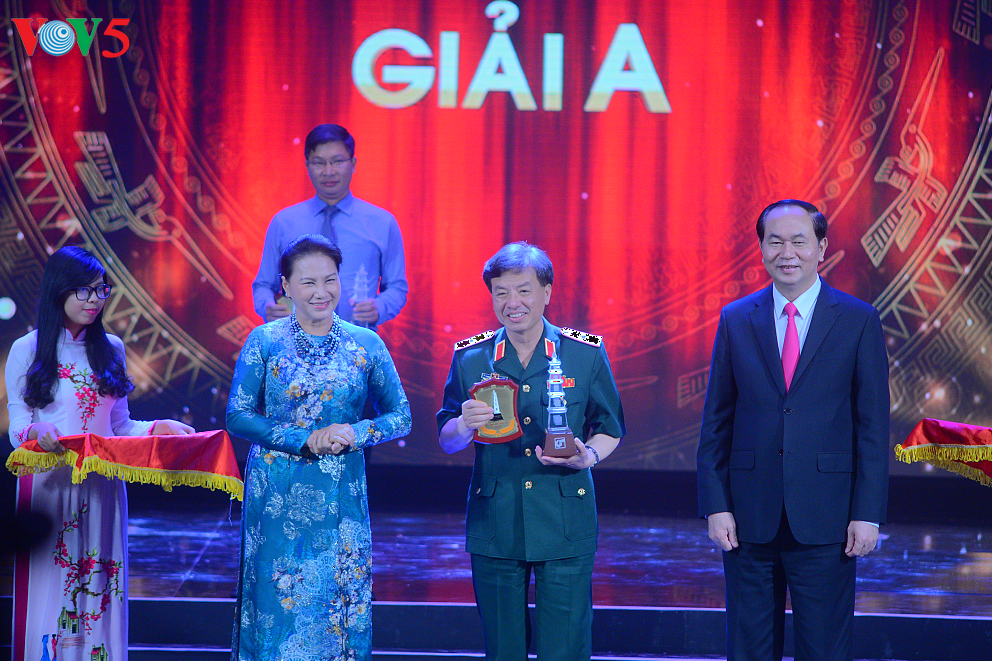 Chủ tịch Nước Trần Đại Quang (ngoài cùng bên phải), Chủ tịch Quốc Hội Nguyễn Thị Kim Ngân (thứ hai từ trái sang) tại lễ trao giải