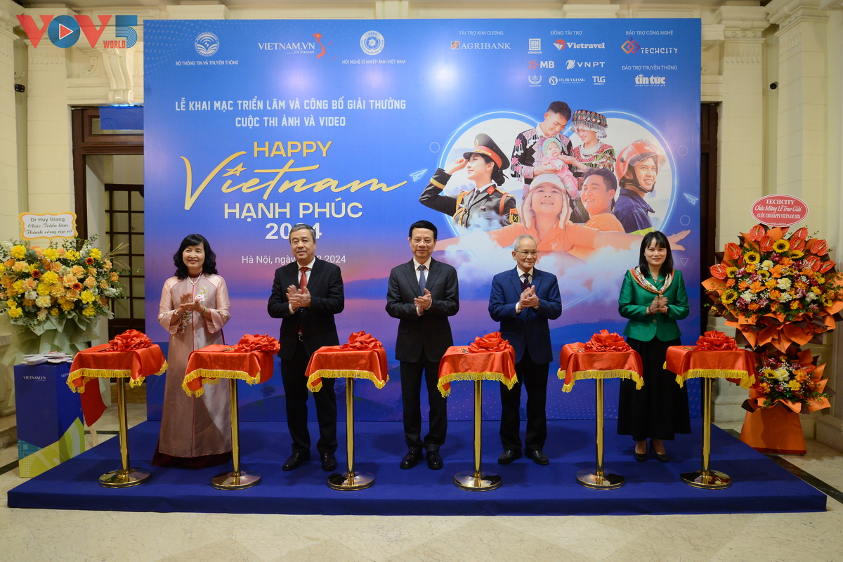 | Bộ trưởng Bộ TT&TT Nguyễn Mạnh Hùng và các đại biểu cắt băng khai mạc triển lãm ảnh, video "Việt Nam hạnh phúc - happy Vietnam 2024" |