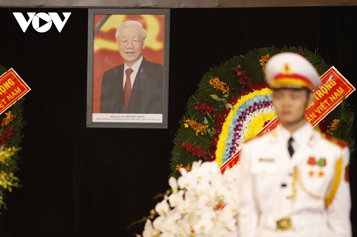 Di ảnh Tổng Bí thư Nguyễn Phú Trọng được đặt trang trọng tại Hội trường Thống Nhất. |