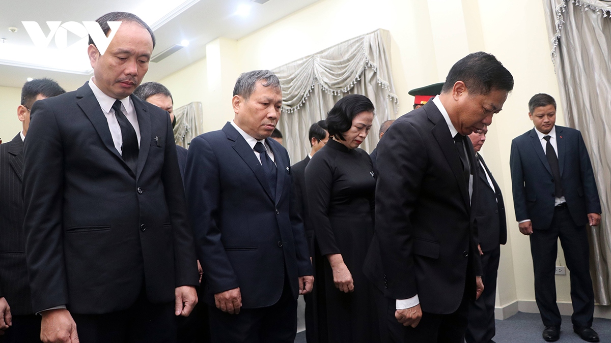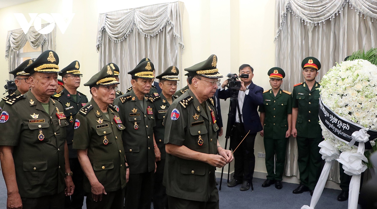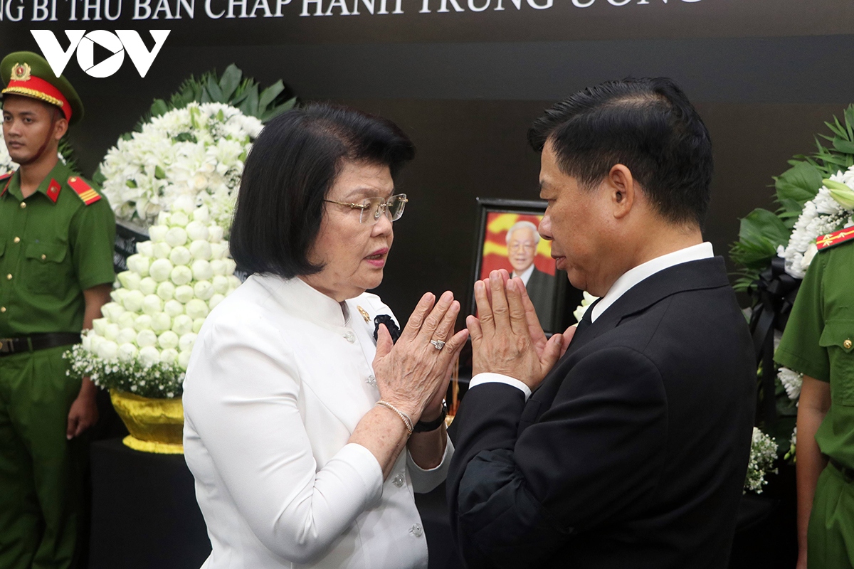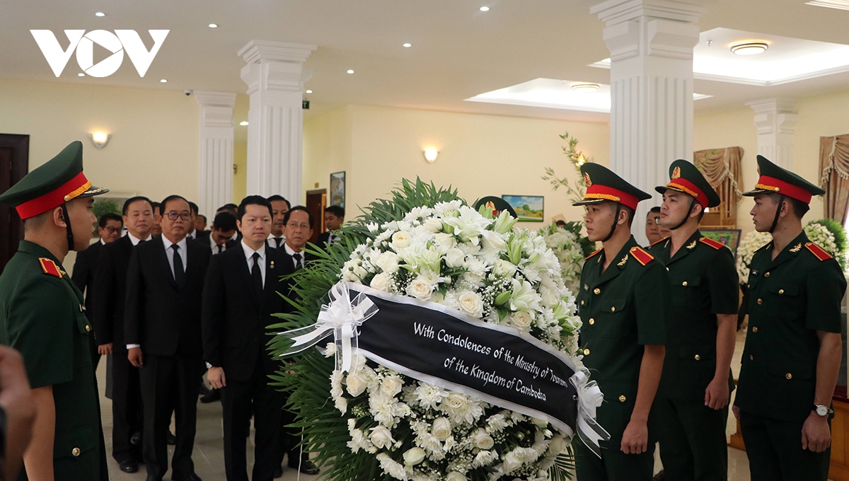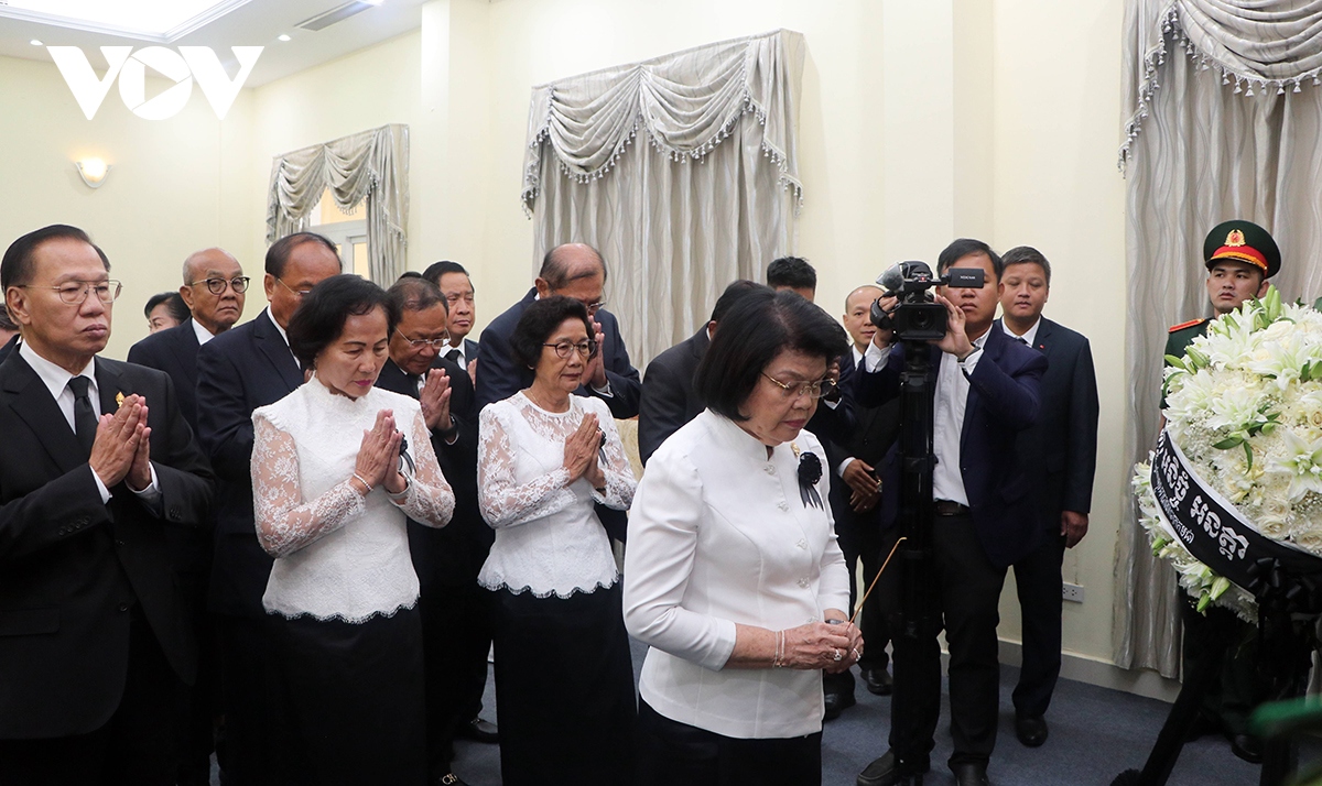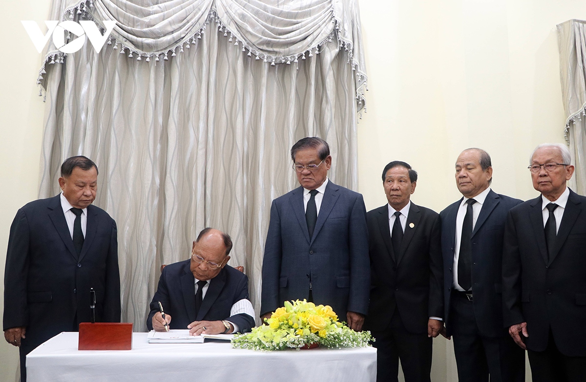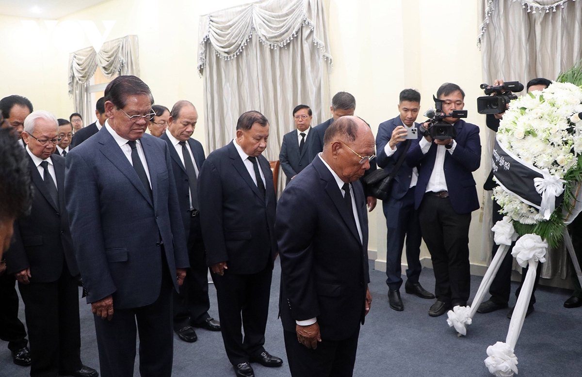 | Đoàn đại biểu Đảng Nhân dân Campuchia do Chủ tịch danh dự Samdech Heng Samrin dẫn đầu vào viếng. |