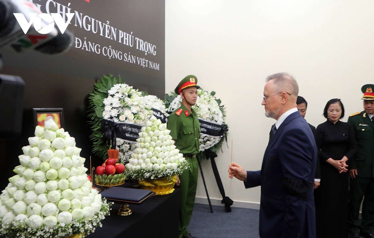 Cũng trong sáng nay, Đại sứ, đại biện đại sứ quán các nước tại Campuchia như: Trung Quốc, Nhật Bản, Nga, Cuba, Mỹ, Pakistan,… đã đến viếng, ghi sổ tang tôn vinh những đóng góp to lớn của Tổng Bí thư trong việc thắt chặt tình hữu nghị, sự hợp tác của Việt Nam với các nước, đồng thời bày tỏ niềm tiếc thương vô hạn và sự chia sẻ sâu sắc tới Đảng, Nhà nước và gia quyến Tổng Bí thư Nguyễn Phú Trọng về sự mất mát này.