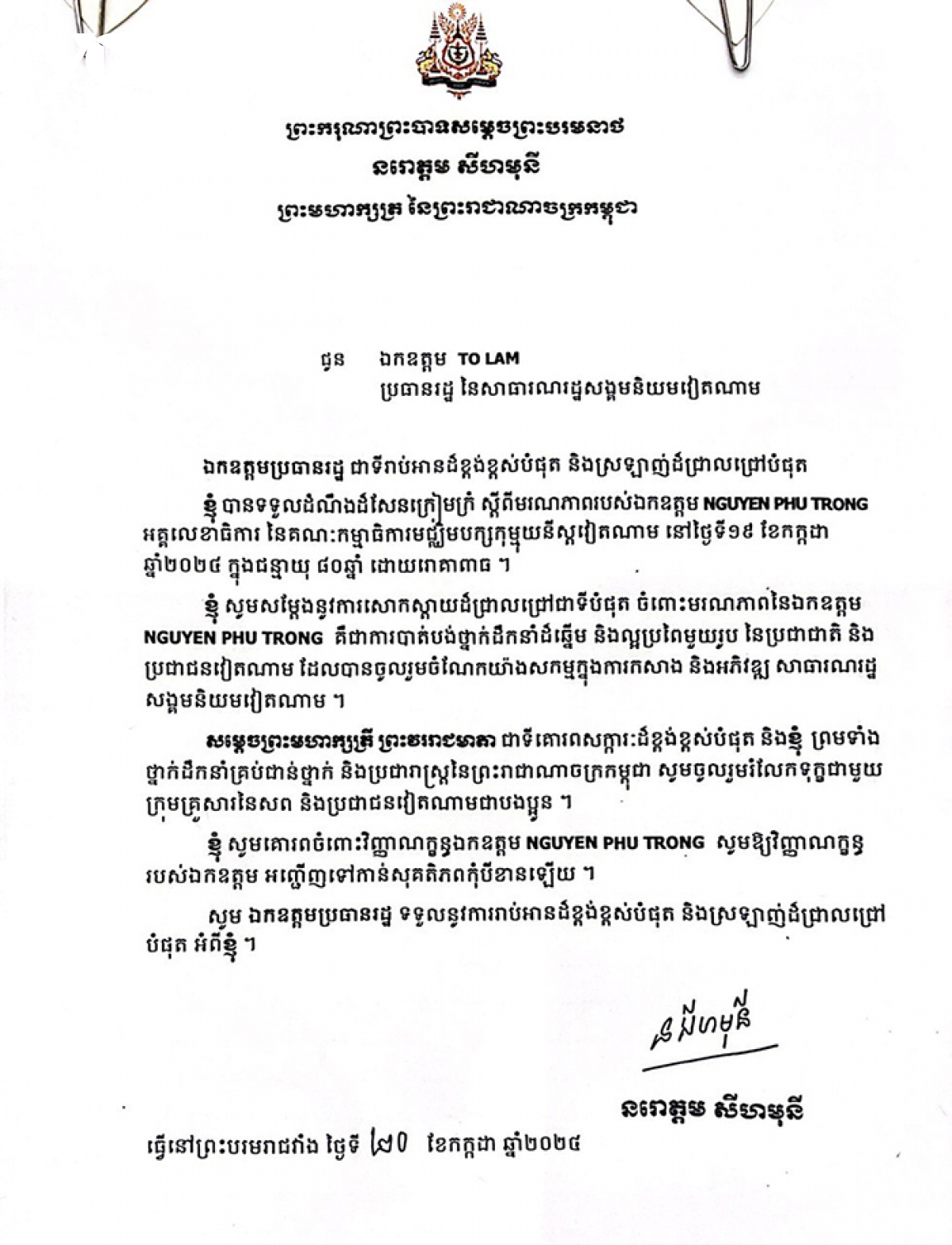 Thư chia buồn của Quốc vương Campuchia Norodom Sihamoni gửi tới lễ viếng bày tỏ “niềm tiếc thương vô hạn” về sự ra đi của Tổng Bí thư Nguyễn Phú Trọng, cho rằng Tổng Bí thư là nhà lãnh đạo kiệt xuất đã góp phần tích cực vào công cuộc xây dựng và phát triển đất nước Việt Nam.