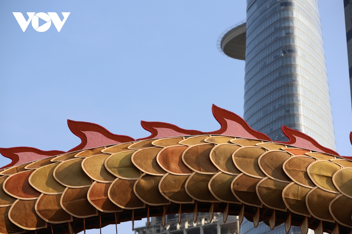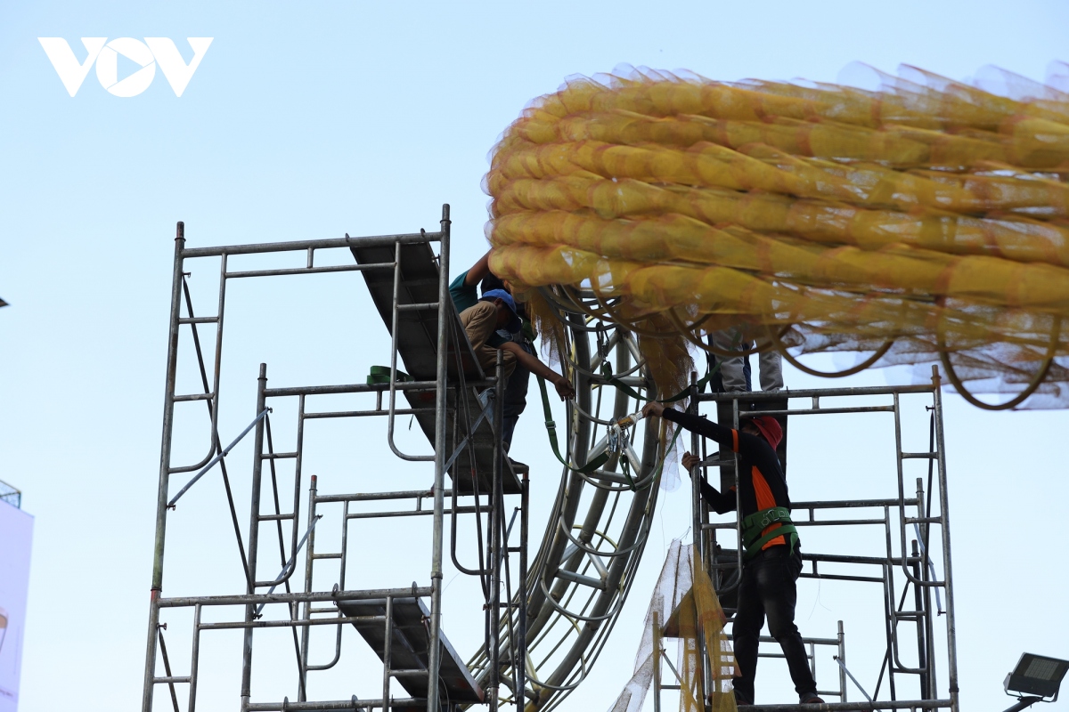 Đến sáng nay (31/1) tức 21 tháng Chạp, đôi linh vật Rồng với tên gọi “Lưỡng Long triều liên” (đôi rồng chầu sen) ngay cổng chào Đường hoa đã dần thành hình hài, sau nhiều ngày thi công.