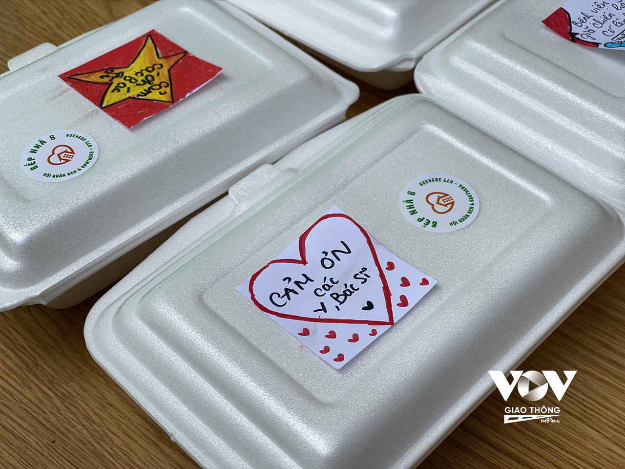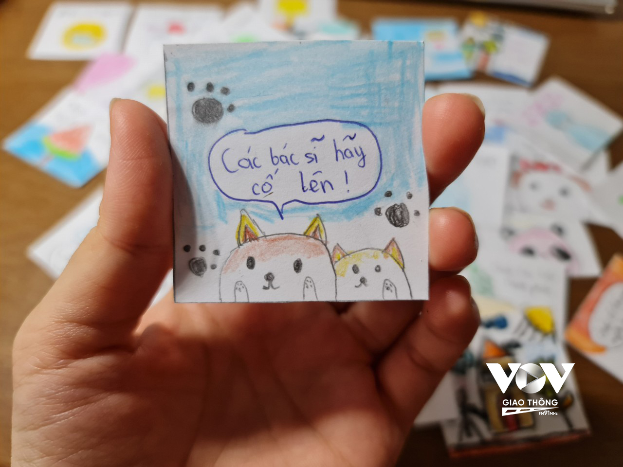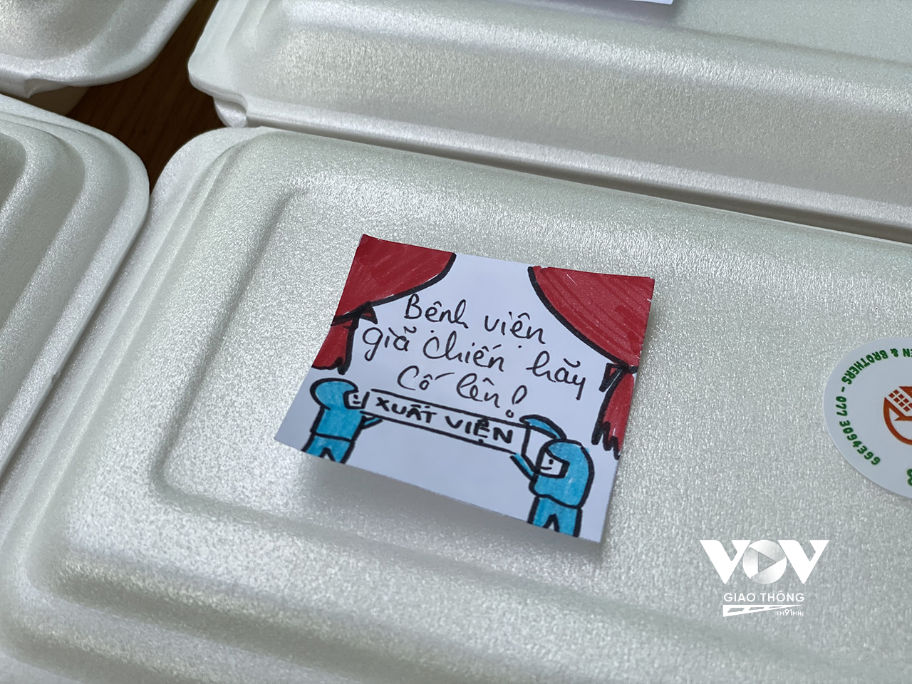 Những bức tranh bé nhỏ, xinh xắn kèm theo lời động viên được dán lên từng suất cơm buổi chiều mỗi ngày gửi tới các Bệnh viện....