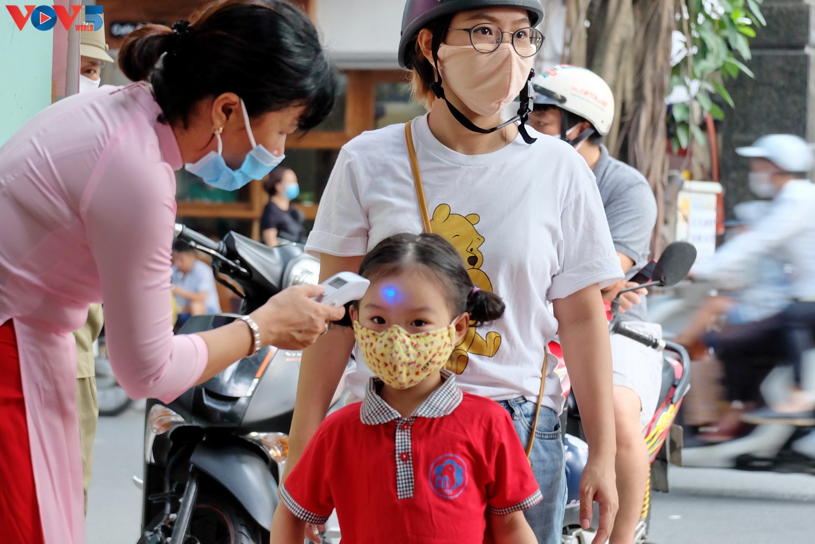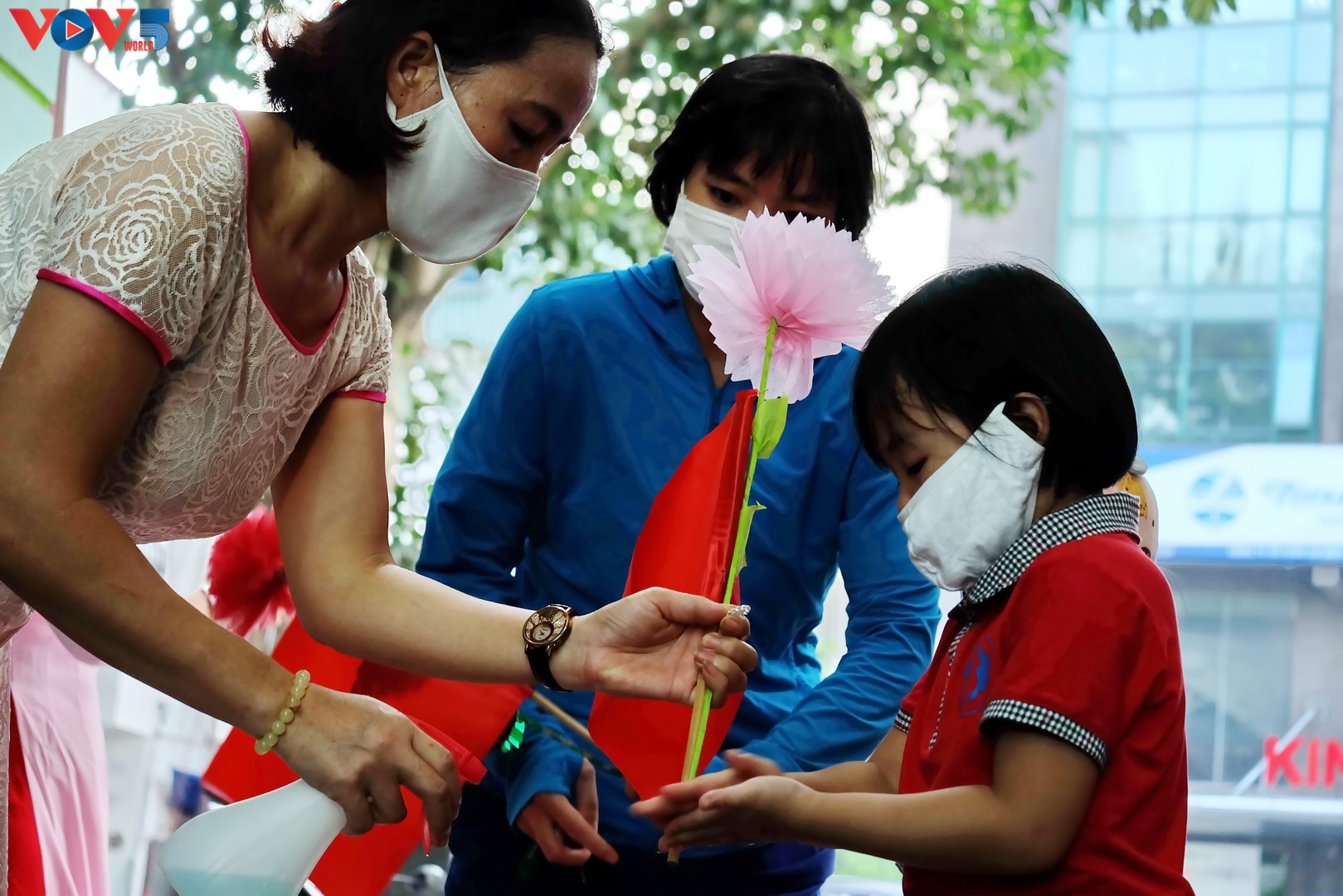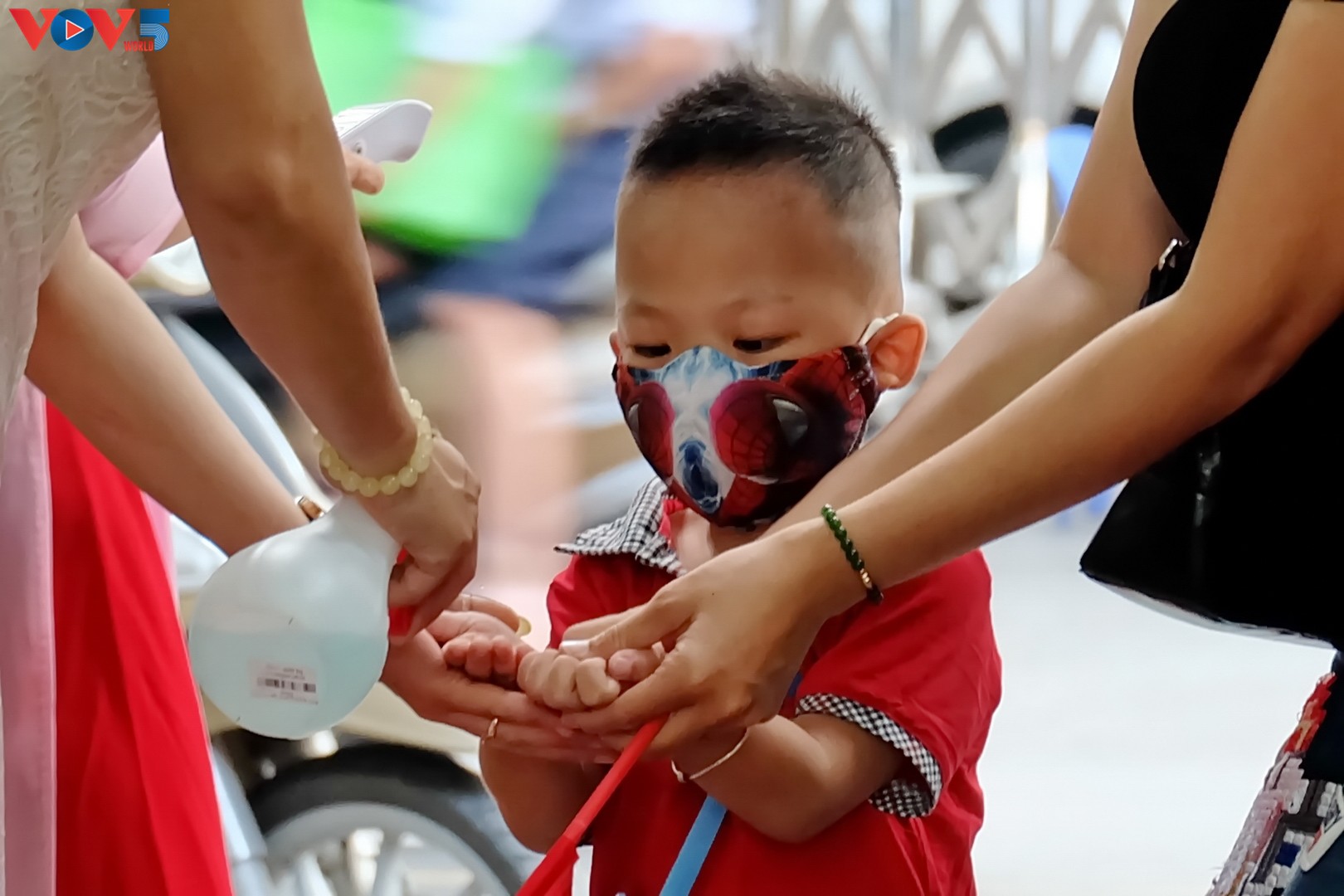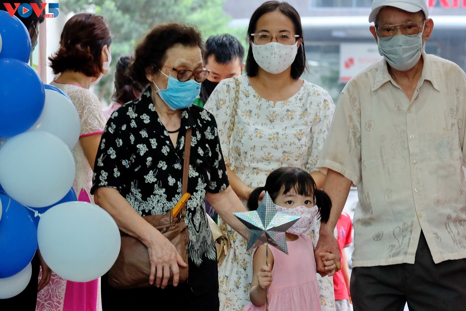 Các bậc phụ huynh đưa bé đến trường đều tuân thủ biện pháp phòng chống dịch COVID-19. |