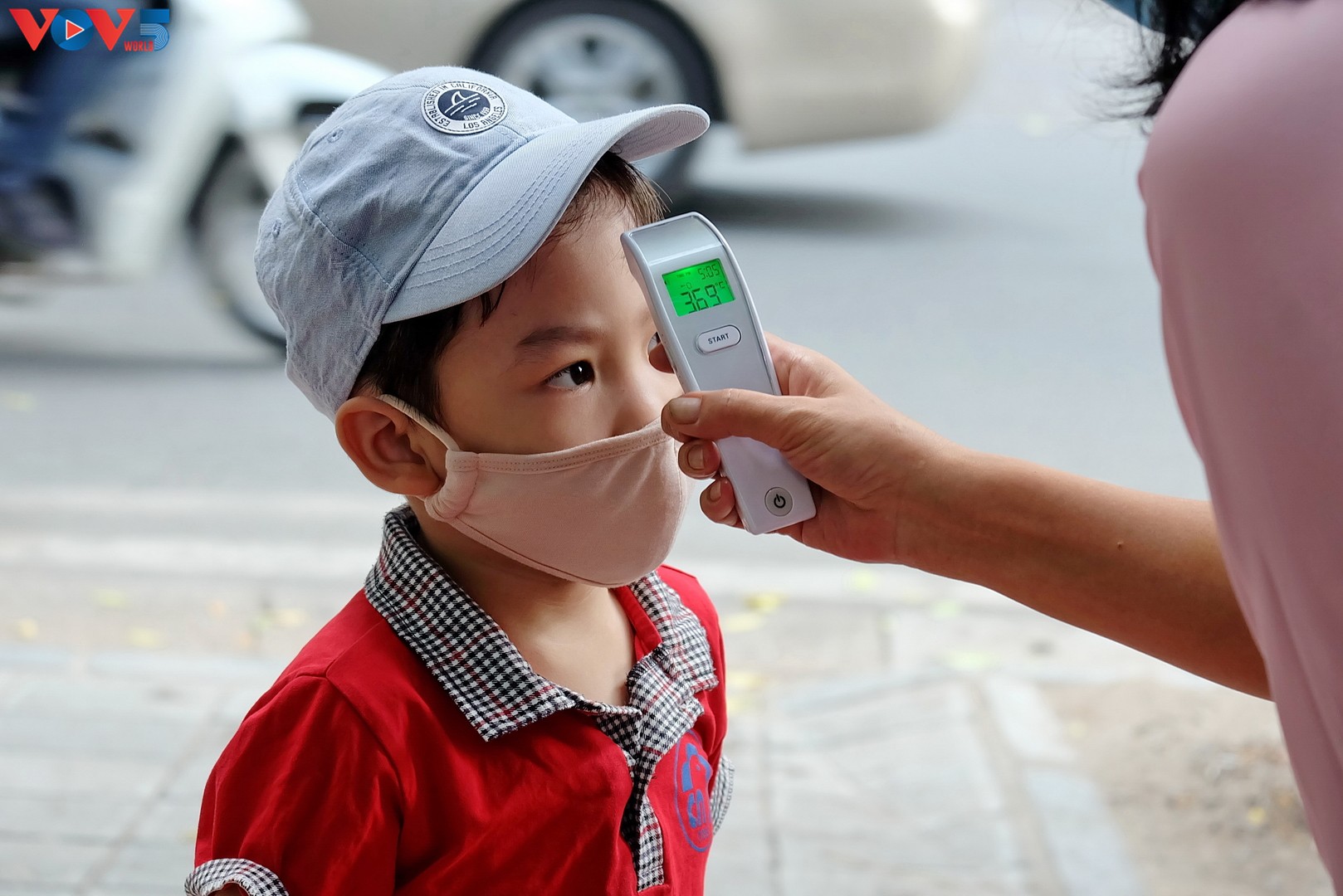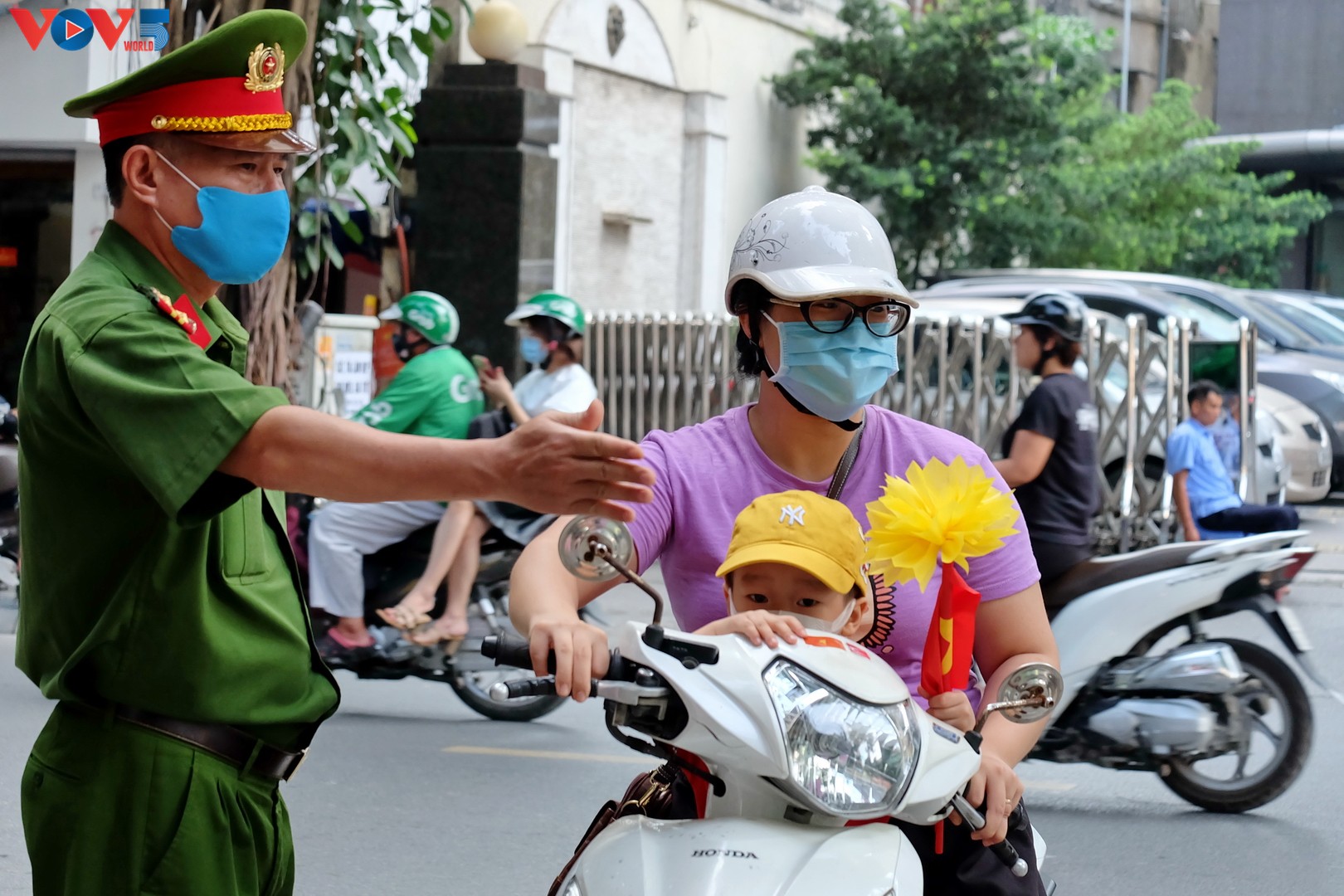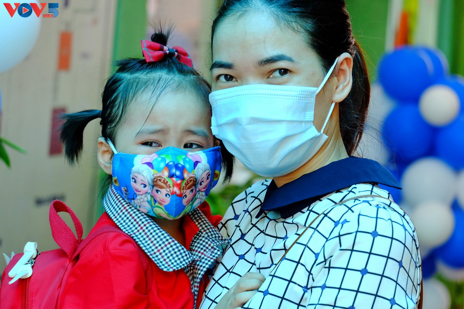 Các bậc phụ huynh đưa bé đến trường đều tuân thủ biện pháp phòng chống dịch COVID-19. |