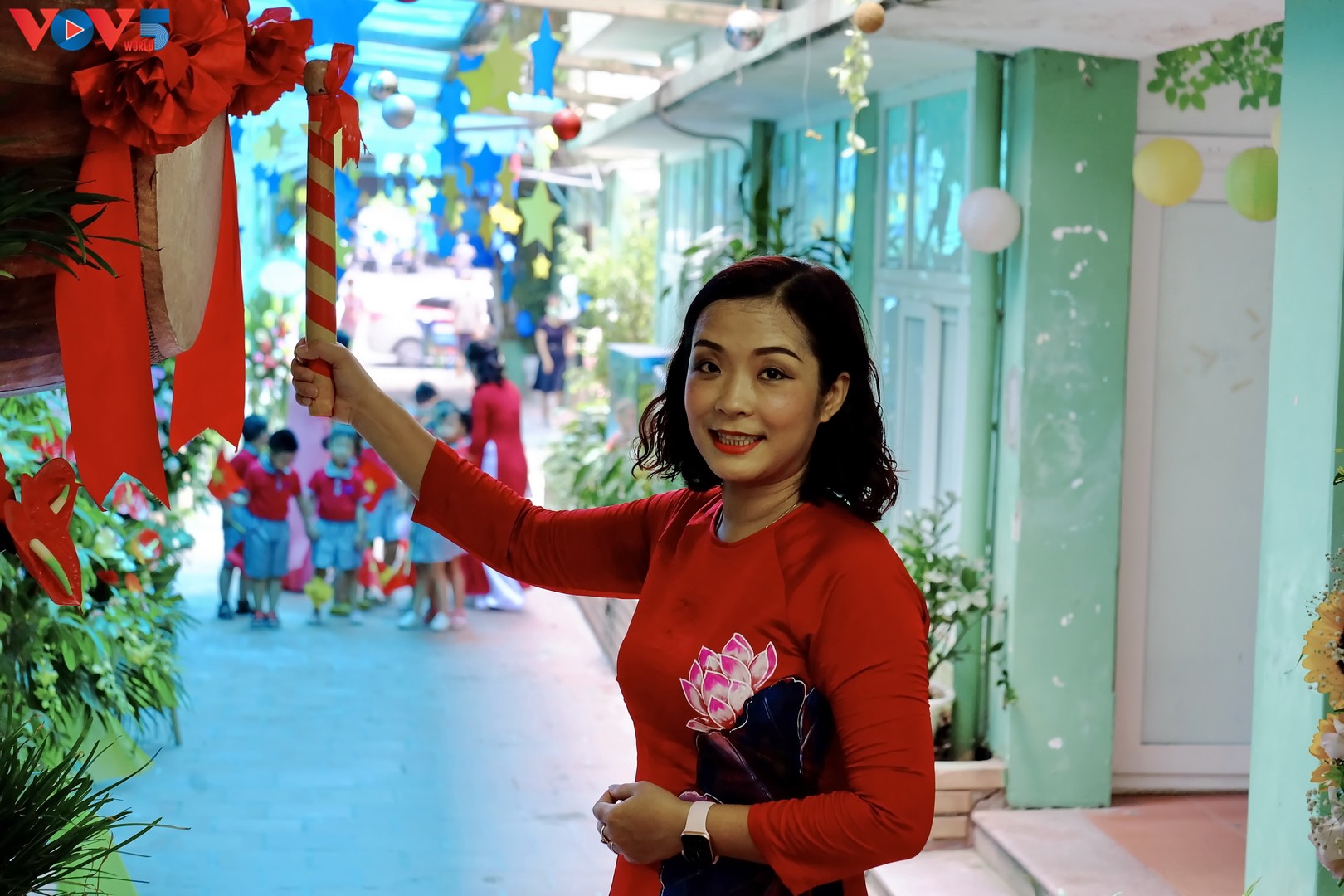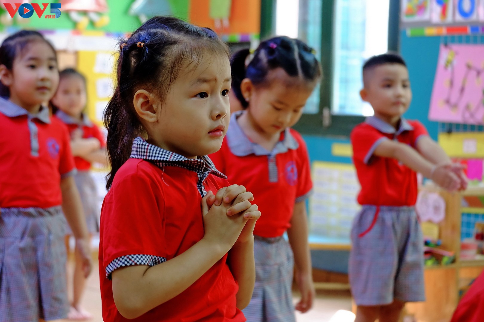Năm nay trường Mẫu giáo Chim Non - Hà Nội thực hiện nghi thức đánh trống khai trường khi tất cả các con đều ngồi riêng trong từng lớp học.