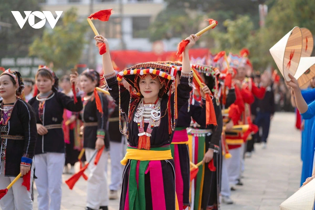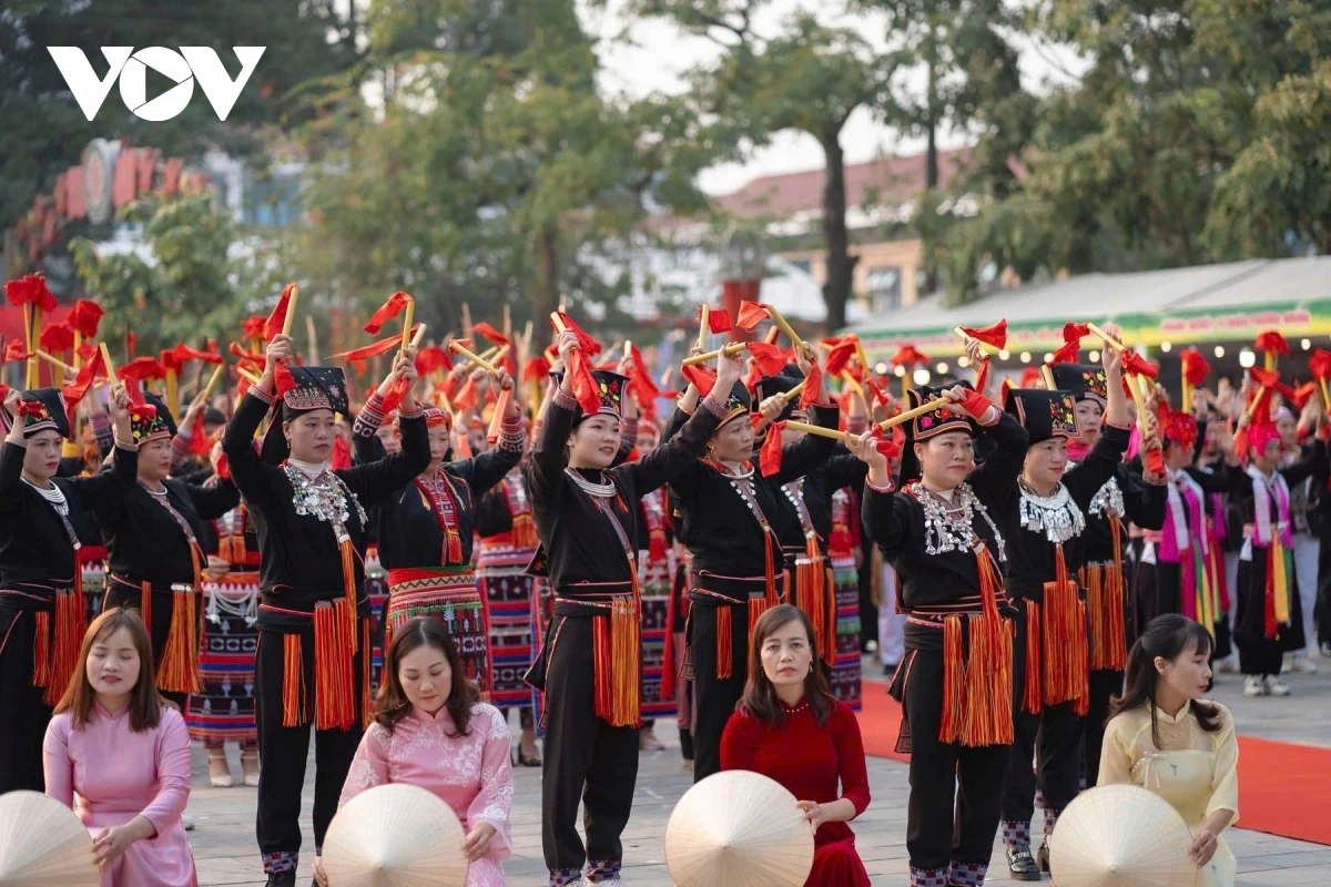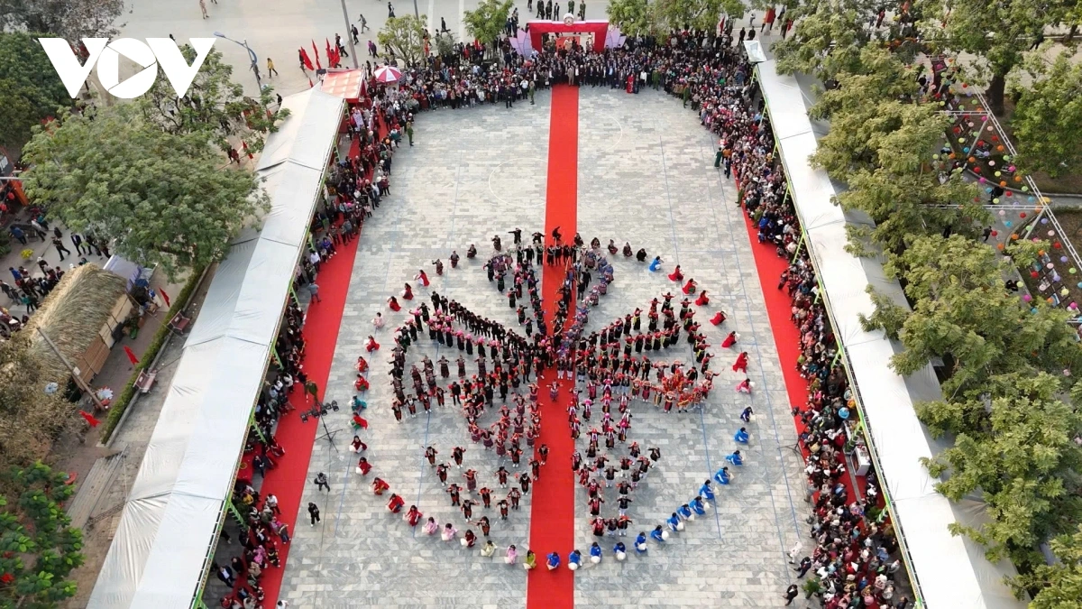 | Màn diễu diễn có sự tham gia của 550 nghệ nhân và nhân dân các dân tộc như Dao, Cao Lan, Tày, Mông, Xa Phó... trên địa bàn huyện |
